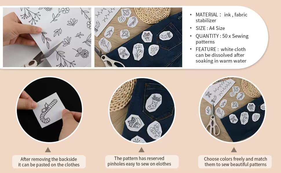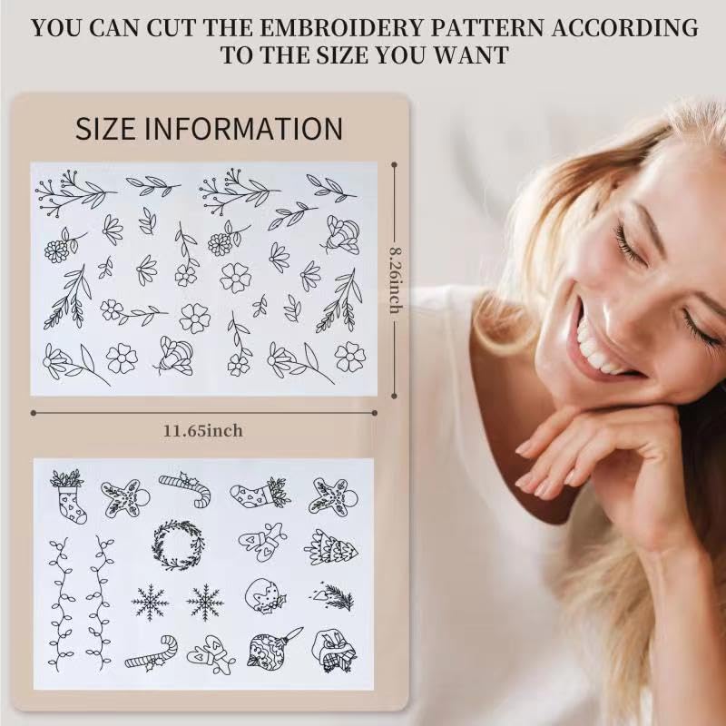 【رفيق تطريز متعدد الاستخدامات】ورقتان من مثبتات التطريز مقاس ايه 4 مع 38 نمط مختلف مطبوع مسبقًا، وهي مثالية لعشاق التطريز والمبتدئين على حد سواء.