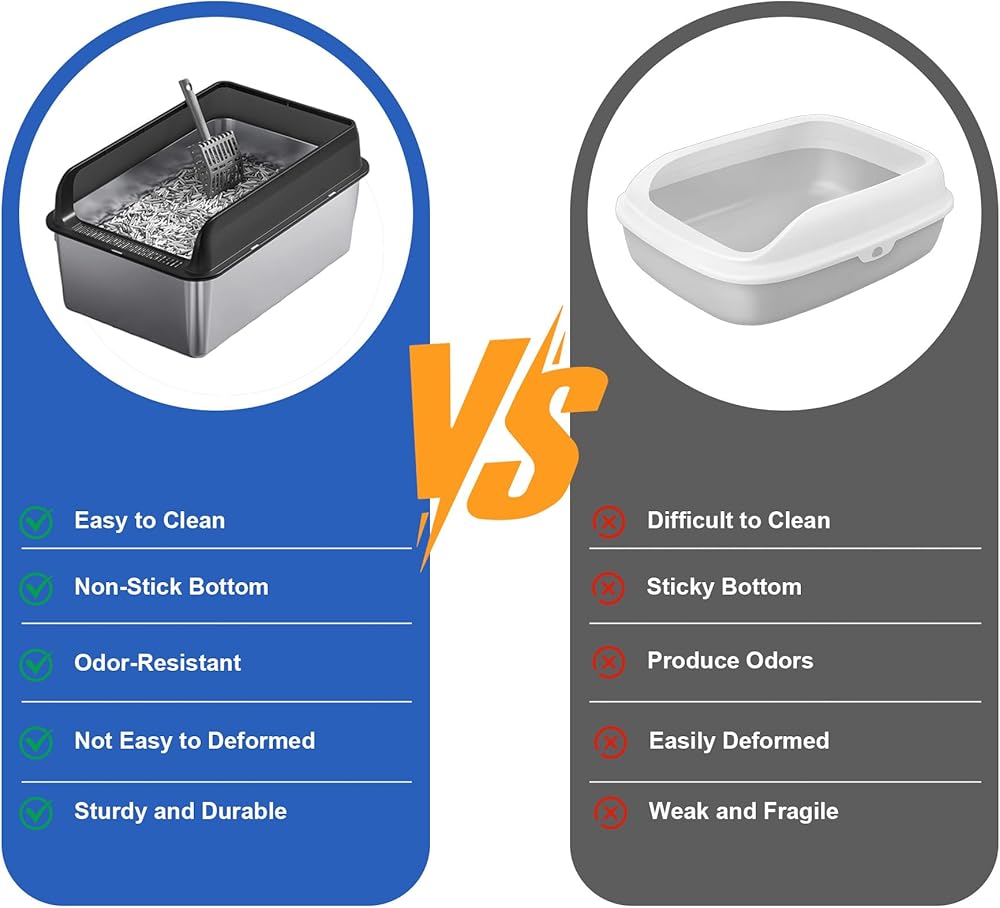 مربع القمامة القطط المصنوع من الفولاذ المقاوم للصدأ: تم تصميم صندوق القمامة القط مع الفولاذ المقاوم للصدأ الصلب وطبقة PP المقوى لضمان قااة التسرب والمتانة الممتازة. صندوق القمامة المعدني هذا مقاوم للخدش ومقاوم للصدأ ، مما يجعله اختيارًا موثوقًا لاستخدامك على المدى الطويل ولتلبية احتياجات قطتك.