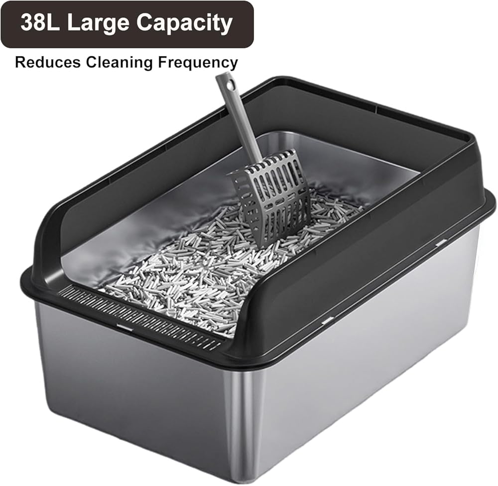 سعة كبيرة: 6 '' 'صندوق القمامة القطط الفولاذ المقاوم للصدأ العميق ، مناسب لمعظم القطط. يقيس صندوق القمامة القط 23.6'l x 15.7'w x 9.8'h ، ويمكن أن يحمل 30 لترًا من فضلات القط ، والتي يمكن استخدامها بواسطة قطة واحدة لمدة 7 أيام ، لذلك لا داعي للقلق بشأن تغيير فضلات القط أثناء رحلة قصيرة.