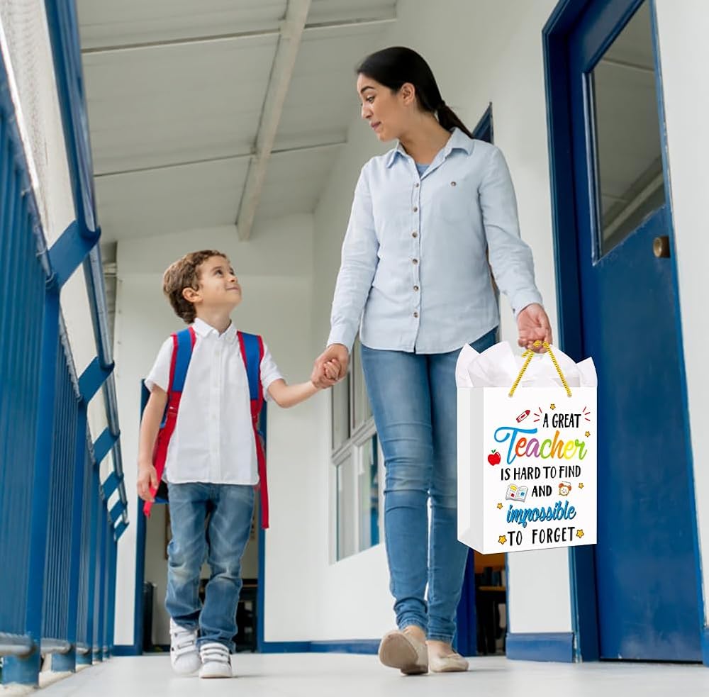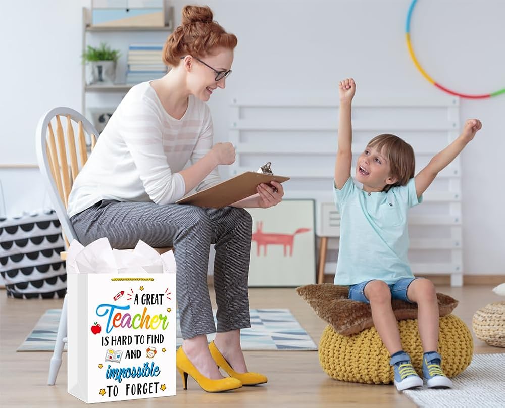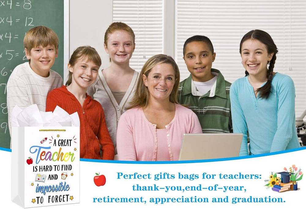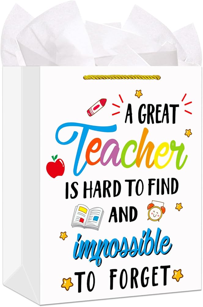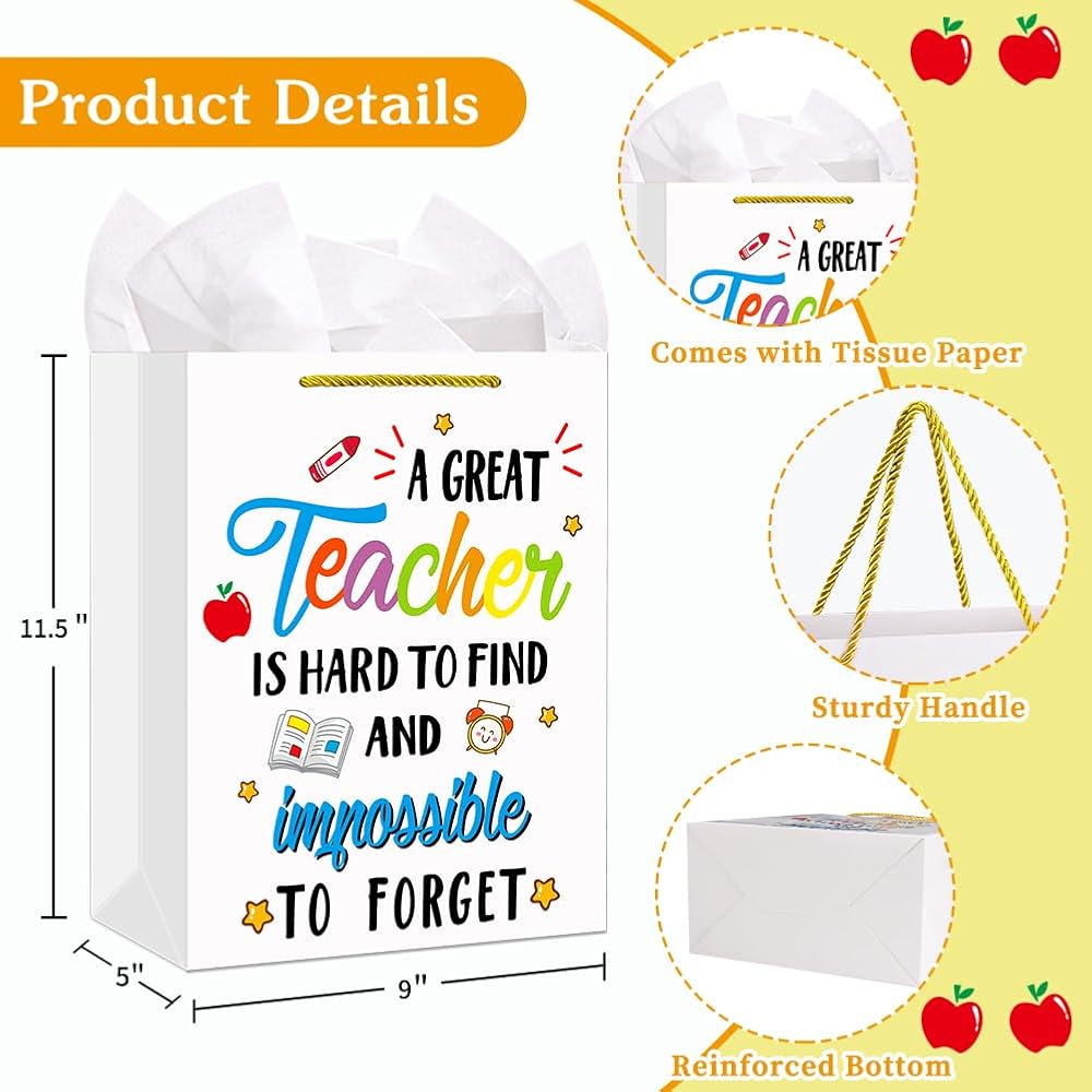 حقيبة هدايا تقدير المعلم مع ورقة الأنسجة : يتم طباعة أكياس هدايا المعلم مع "من الصعب العثور على معلم رائع ومن المستحيل نسيانه" ، حقيبة هدايا تقدير المعلم العظيمة للنساء من الذكور المعلمين المعلمين في مرحلة ما قبل المدرسة.