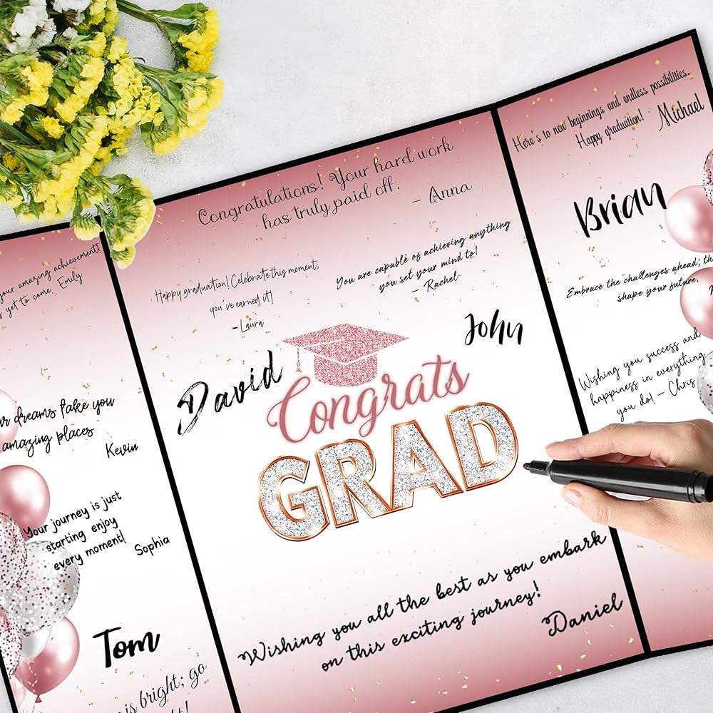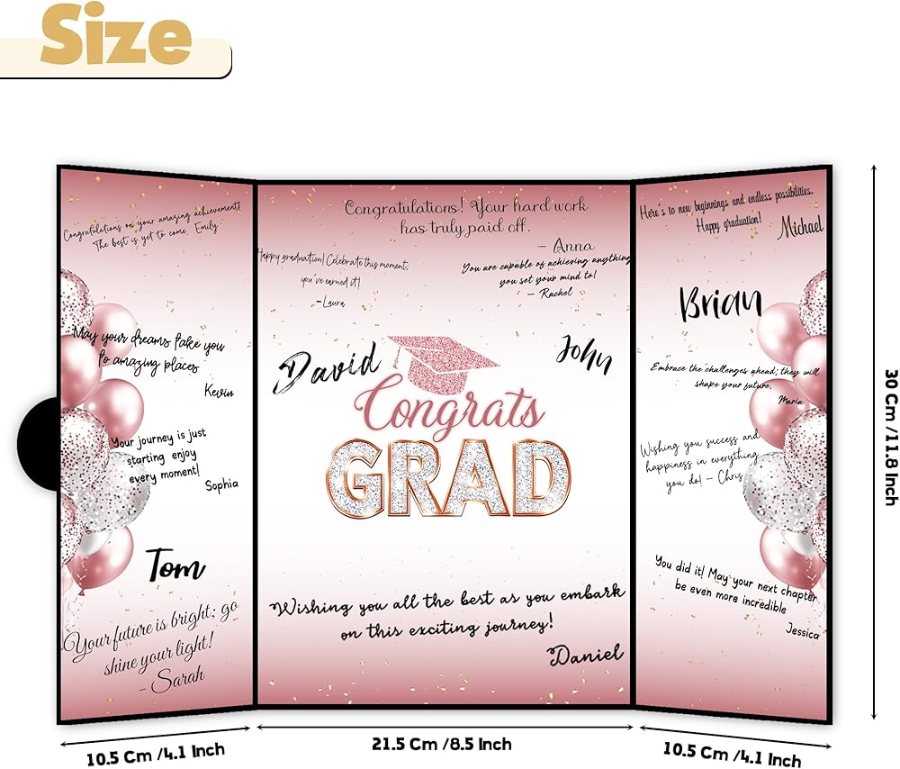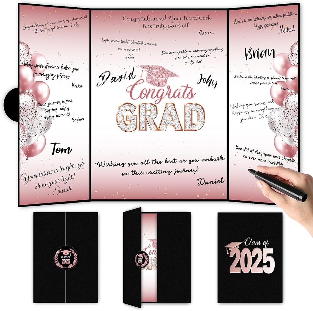• فسيحة ومصممة بعناية : مع غطاء كبير 18 × 12 بوصة وتخطيط داخلي ثلاثي الأفق ، هناك مساحة كبيرة للجميع لكتابتها. تتميز الصفحة المركزية بالعبارة الجريئة "Class of 2025" "Grad" ، بينما توفر اللوحات الجانبية مناطق واسعة للتوقيعات والملاحظات. مزيج مثالي من الشكل والوظيفة.