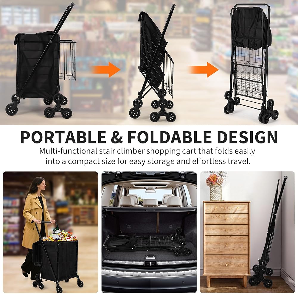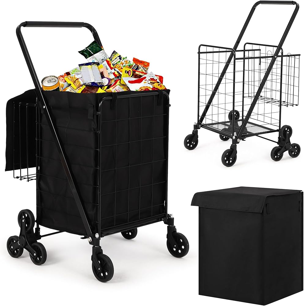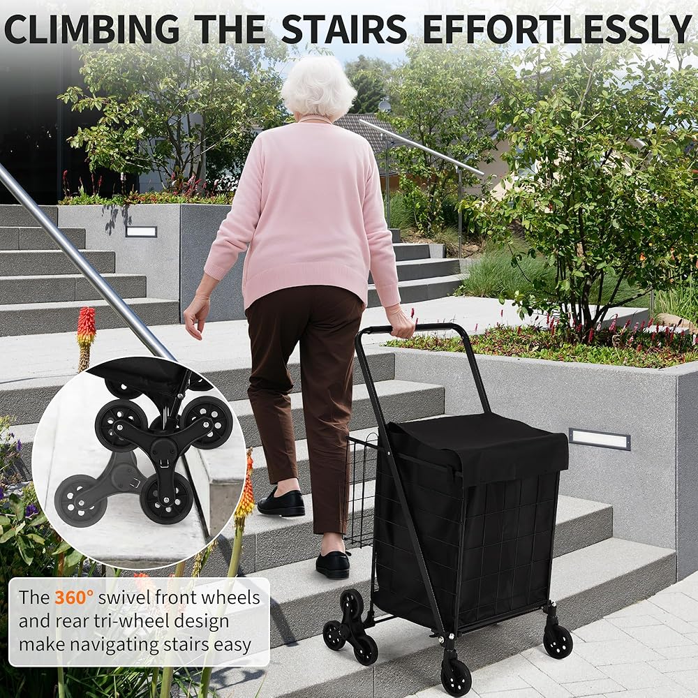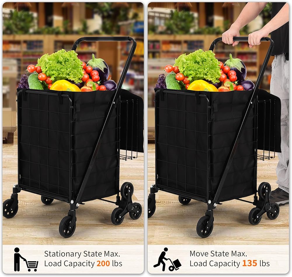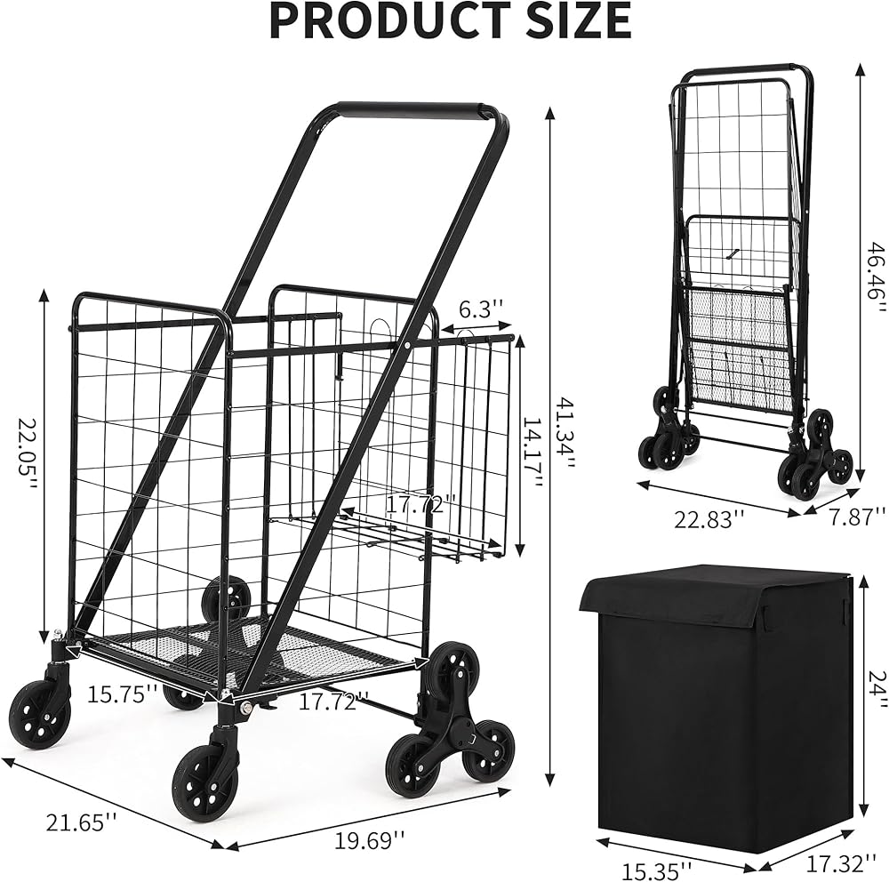 عربة التسوق بقالة ، تسوق الدرج التسوق مع بطانة سلة مقاومة للماء وعجلات دوارة 360 درجة ، بقالة قابلة للطي محمولة للغسيل ، التخييم للأمتعة ، الأسود