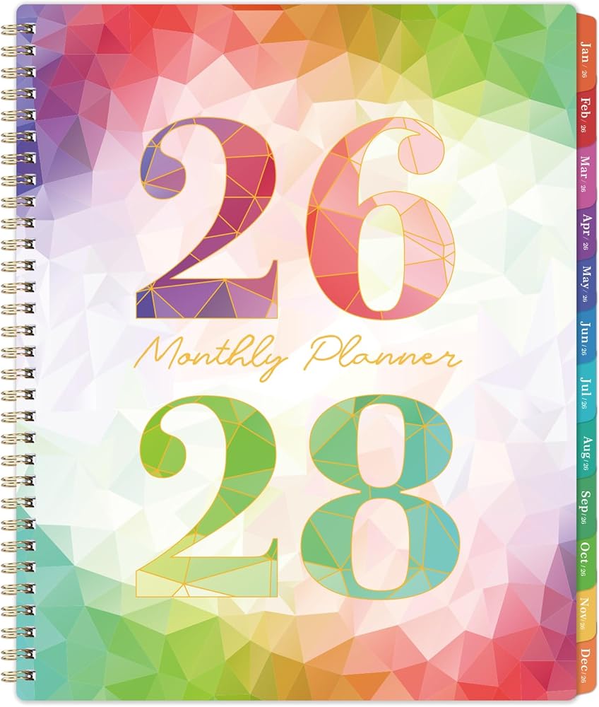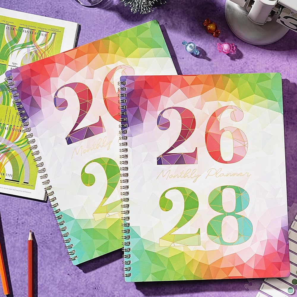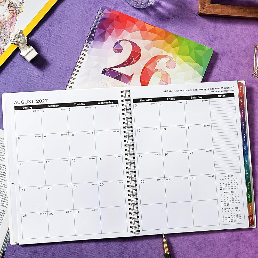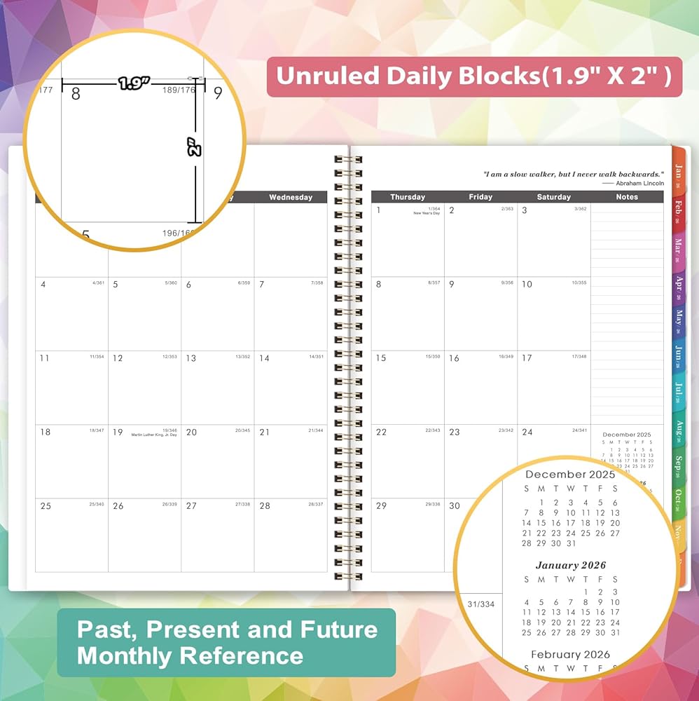 نظرة عامة شهرية -تنتشر صفحات الخطة الشهرية للمخطط الشهري 2025-2026 على صفحتين مع مساحة كبيرة للكتابة وكتل غير معروفة لكل يوم للكتابة بحرية. كل شهر لديه إشارة شهرية من الشهر السابق إلى التالي ، وكذلك تواريخ جوليان وتذكير العطلات لتسهيل تخطيطك
