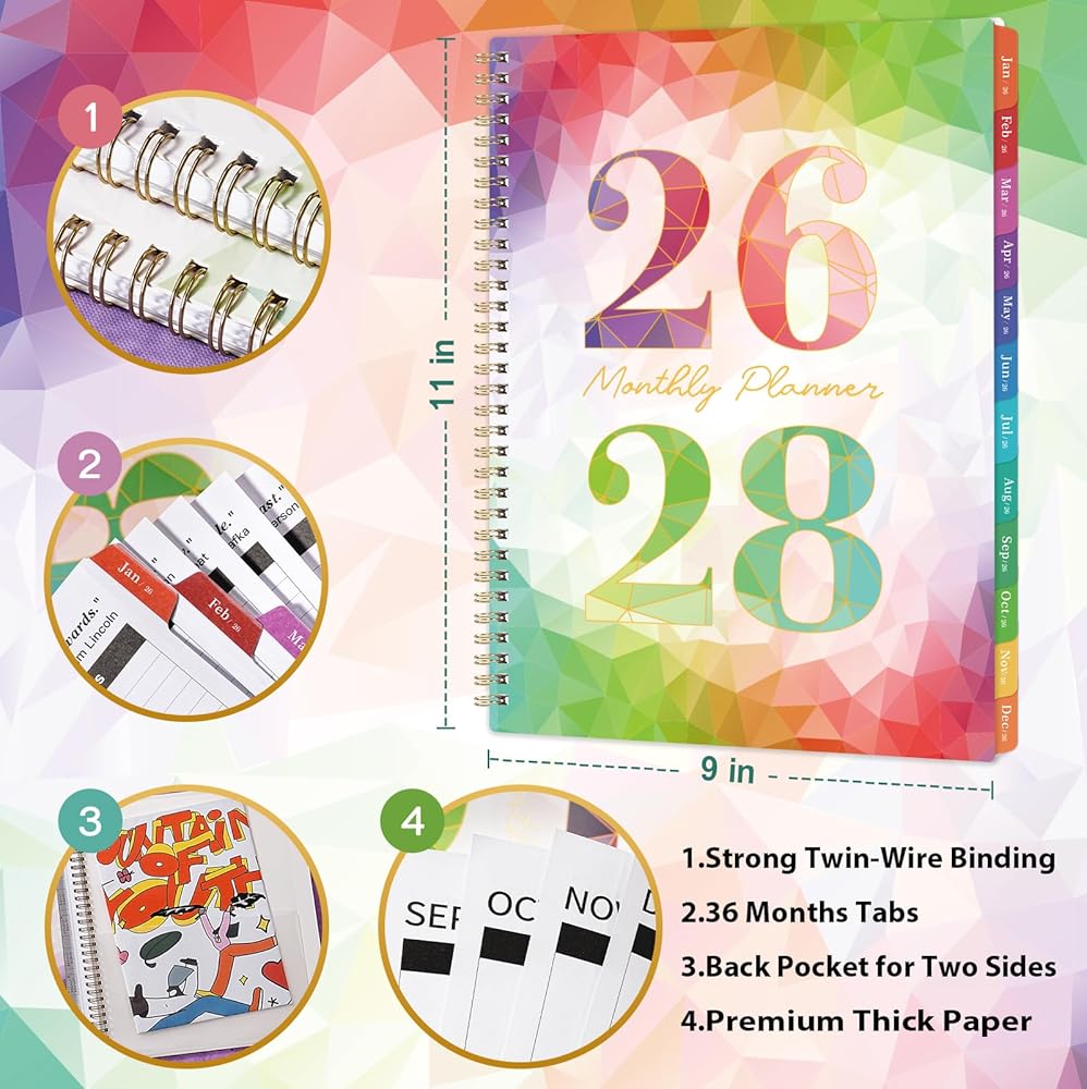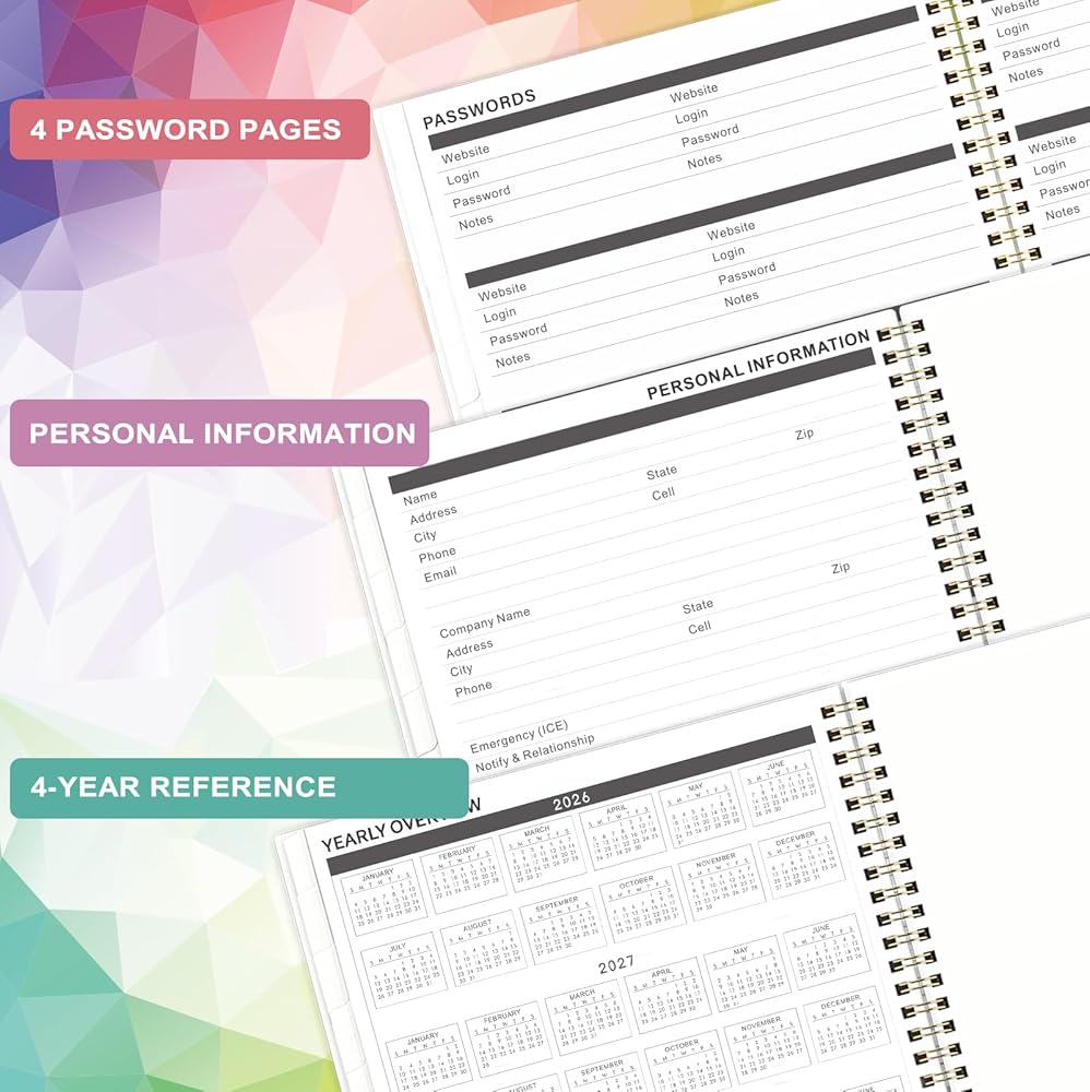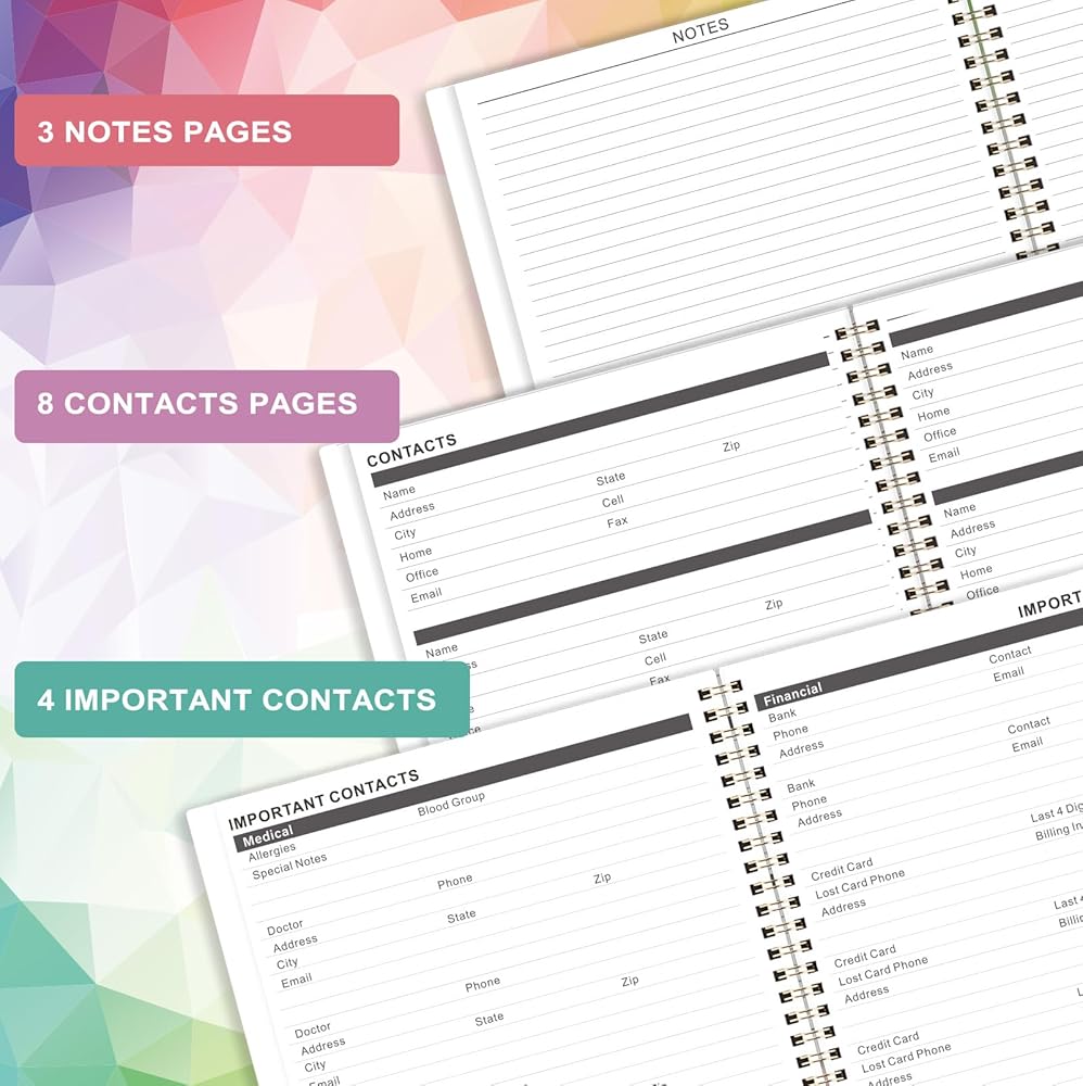 استخدامات متعددة-غلاف الختم الذهبي+ ملزمة قوية مزدوجة الأسلاك+ 36 علامات تبويب ملونة للمرجع السريع+ الجيب على الوجهين لعقد بعض العناصر+ 12 صفحات جهات الاتصال+ 4 صفحات كلمات مرور+ 3 ملاحظات صفحات+ عطلة أو نظرة عامة سنوية (2025-2028)