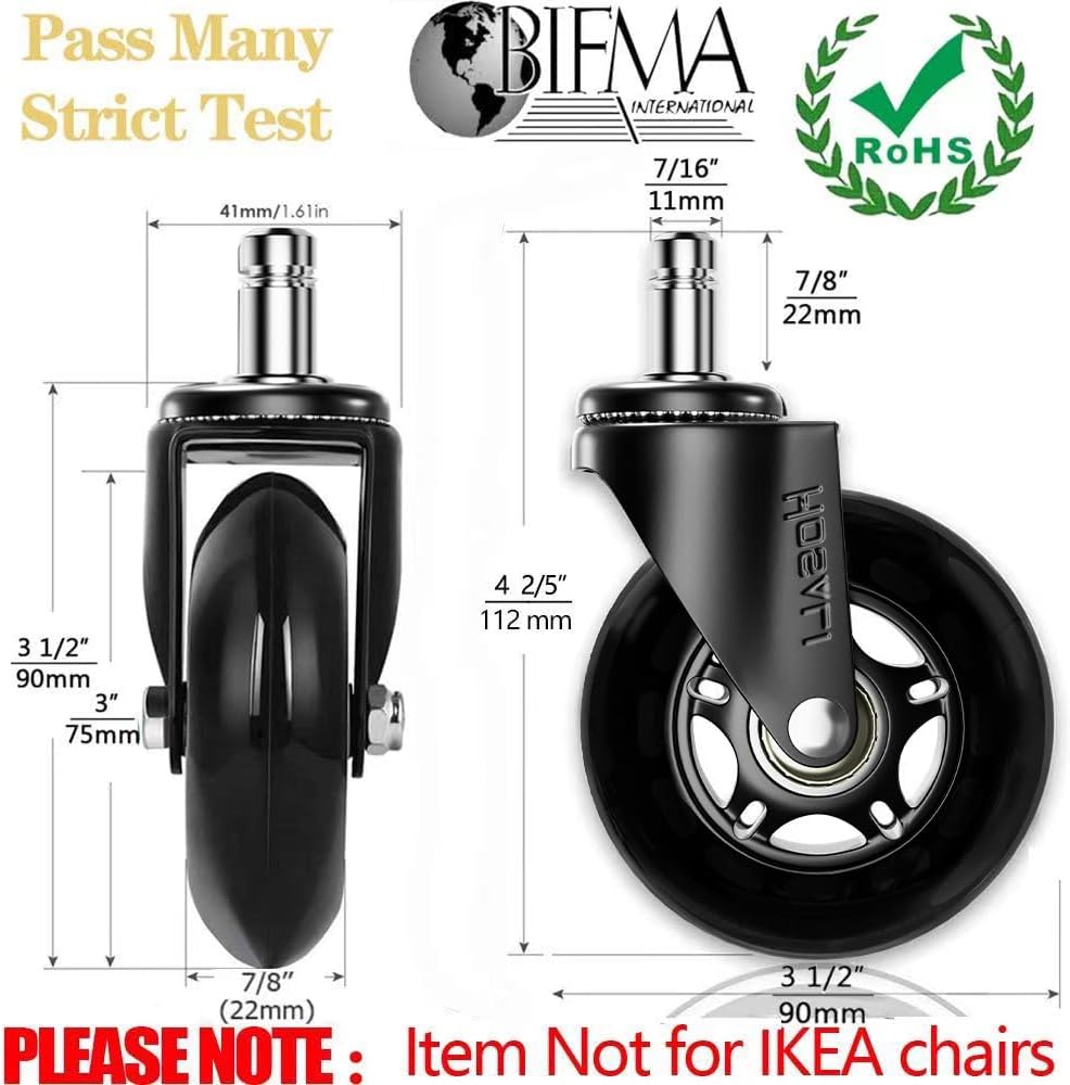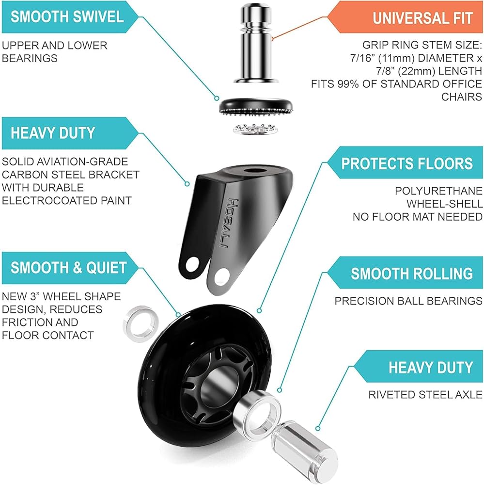دوران سلس وهادئ - لا تصدر أصواتًا وخشخشة من كرسي مكتبك بعد الآن. محامل كروية دقيقة وهيكل عجلة من البولي يوريثين الناعم يجعل الكرسي المتدحرج سلسًا وهادئًا على أي سطح دون إزعاج أي شخص. عجلات الكرسي المطاطية مصممة لتناسب المقاس القياسي العالمي: 7/16 بوصة × 7/8 بوصة (11×22 مم)، مناسبة ل99% من كراسي المكتب مثل ميلر ستيلكيس، أيرون، هيرمان، دكسريسرر، حرية الإنسان ، لايزي بوي سيراتا، هون، بوس، إلخ. هام: ليس لكراسي ايكيا.