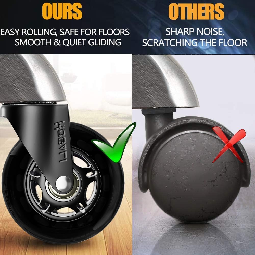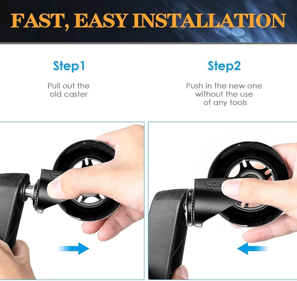 سهلة التجميع - ستبدو كراسي مكتبك أكثر جاذبية باستخدام عجلات كرسي المكتب هذه. لا تتطلب عجلات العجلات الخاصة بنا أدوات للاستبدال، ببساطة اسحب العجلات القديمة من قاعدة الكرسي، وادفع جذع عجلات الكراسي الجديدة إلى المقبس وينتهي في 10 دقائق.