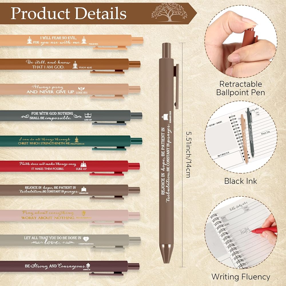 Each ballpoint pen offers a comfortable grip and smooth writing experience. And the elastic band can hold the pens, convenient for note taking, bible study or personal journaling.