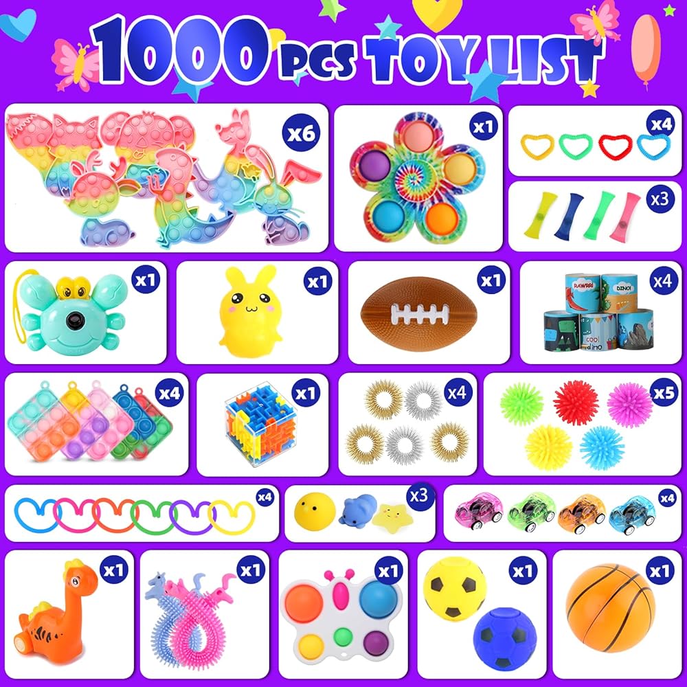 1000pcs حزمة ألعاب Fidget ، تفضل الحفلات السائبة للأطفال ، وتخزين الحشوات ، وصندوق الكنز ، وحفل عيد ميلاد ، وجوائز الكرنفال الفصول الدراسية ، وأشكال Pinata ، و goodie أكياس ، وتخفيف الإجهاد ، واللعب الحسي