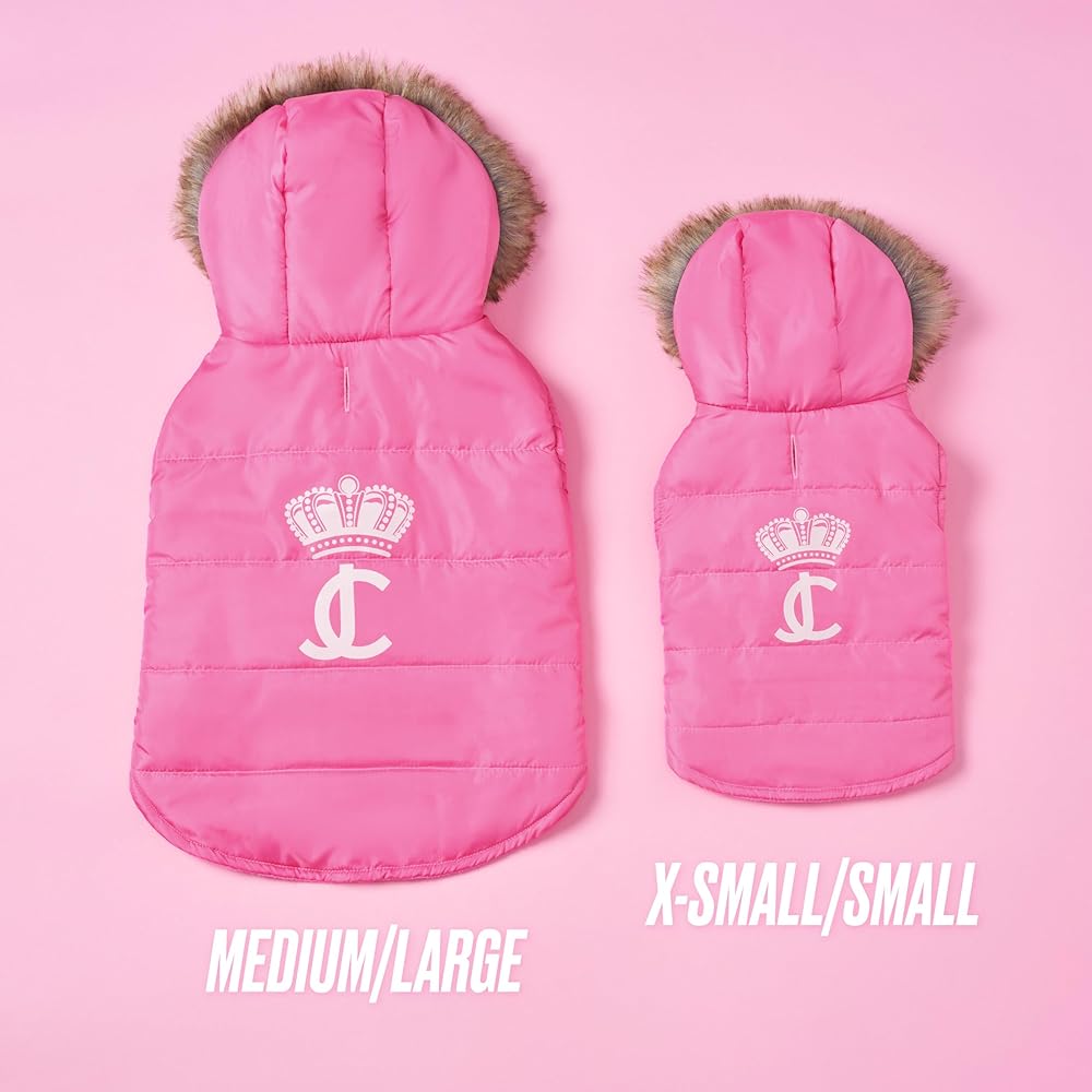 Elevate your pet's style and warmth with the Juicy Couture Crown Puffer Hooded Pet Jacket. Designed by the LA lifestyle brand known for casual glamour, this pet jacket embodies their unique spirit. Keep your furry friend cozy during cold weather with the faux fur hood while ensuring easy on-and-off convenience. Whether you're looking for dog cold-weather gear or fashionable pet attire, this hooded pet outfit has got you covered. Embrace winter in style, and let your pet enjoy a touch of couture in their everyday adventures.