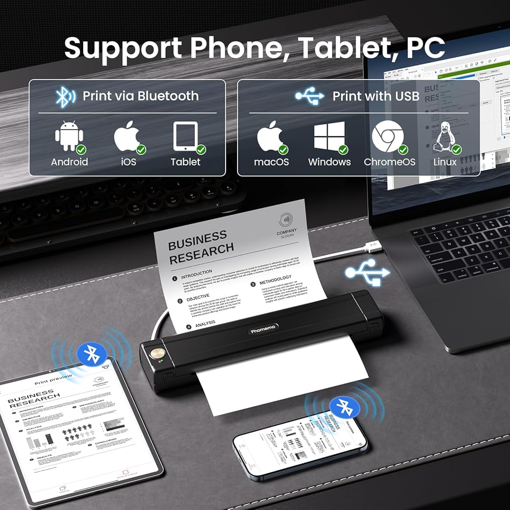 Wireless Bluetooth Printer: Download "Phomemo" App, print PDF, Word, Images, Web pages from your phone from anywhere. The portable thermal printer compatible with iPhone, Android Phone, iPad via Bluetooth, easy to connect. It's also a portable printer for laptop, you can use USB-C Cable to connect laptop or computer for printing. (Note: For laptops, need to install the driver first)