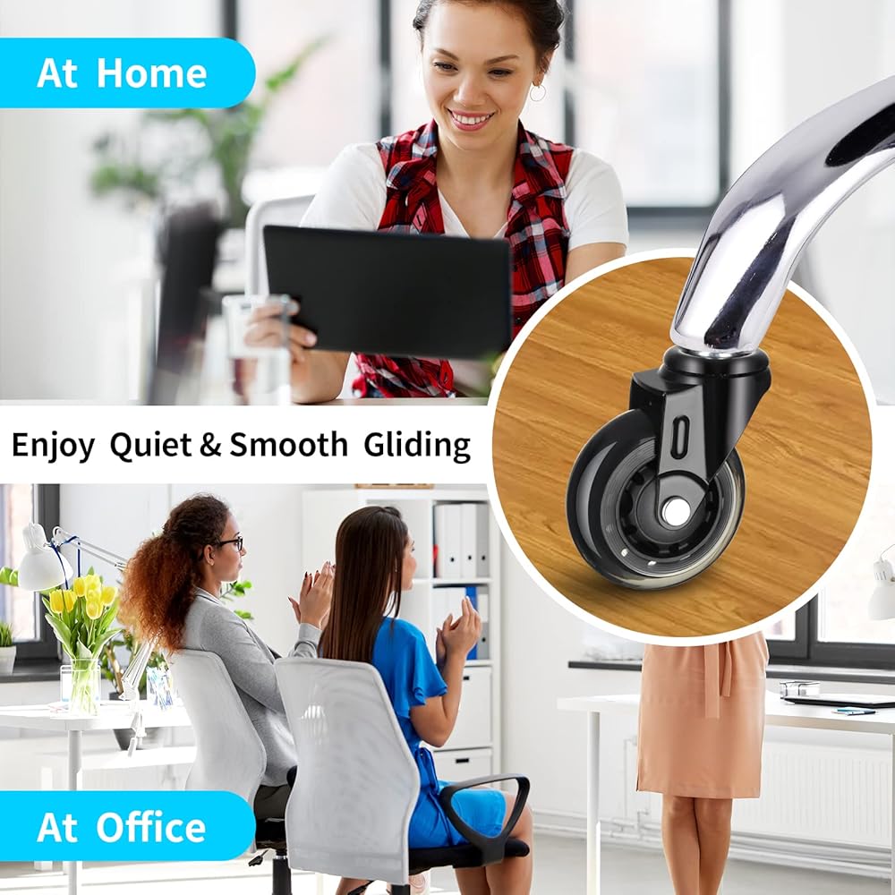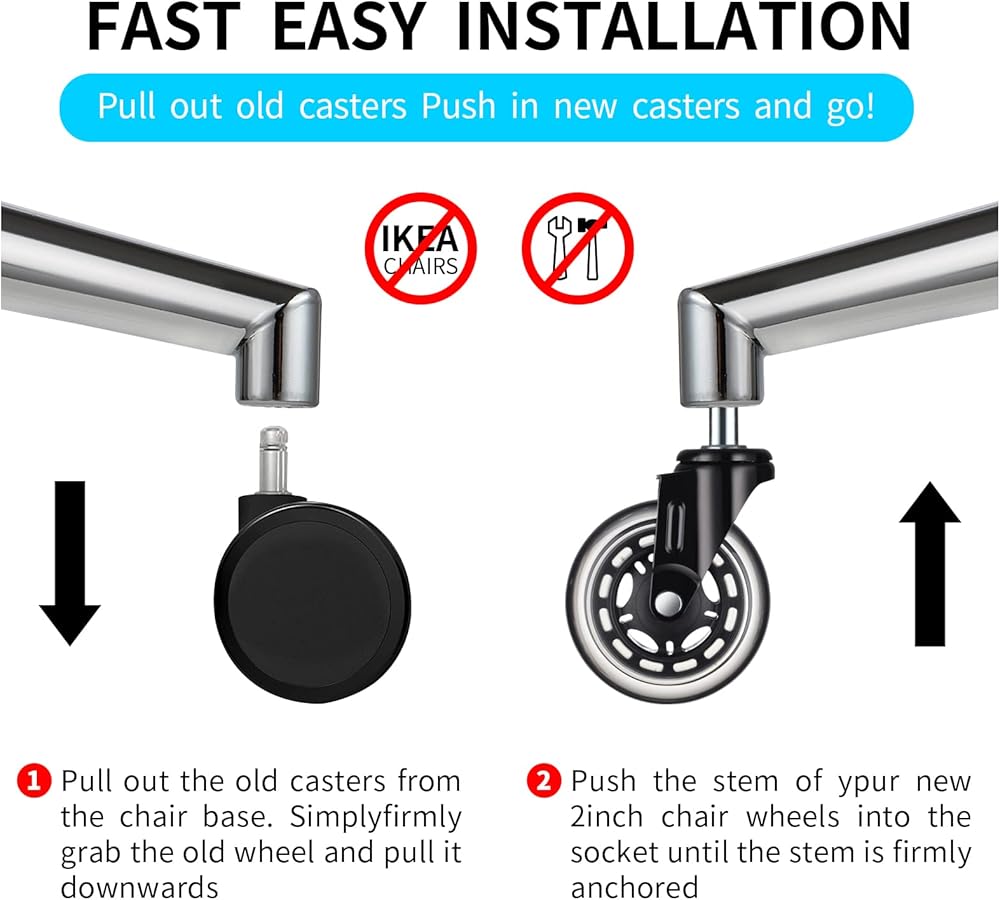【تركيب مريح】 لا توجد حاجة لأي أدوات لتركيب عجلات الأثاث المكتبي. ما عليك سوى سحب العجلات الأصلية ثم دفع العجلات الجديدة عالية الجودة. تنزلق عجلات كرسي مكتب Popolov بسلاسة وهدوء بدلاً من الصرير وعدم الاستقرار الذي تسببه تلك العجلات الرخيصة ومنخفضة الجودة.