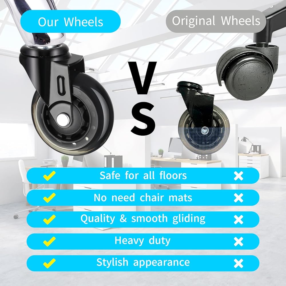 【حماية الأرضيات】تختلف عن عجلات كراسي المكتب التقليدية التي قد تترك خدوش على الأرض، فإن عجلاتنا البديلة الجديدة لكراسي المكتب مناسبة لجميع أنواع الأرضيات تقريبًا بما في ذلك على سبيل المثال لا الحصر الأرضيات الصلبة أو البلاط أو الرخام أو السجاد قصير الشعر. يمكن لمواد البولي يوريثين التي تعتمدها عجلاتنا أن تزيد من قوة الإمساك بالأرضية وذلك لحماية الأرضية من التلف.