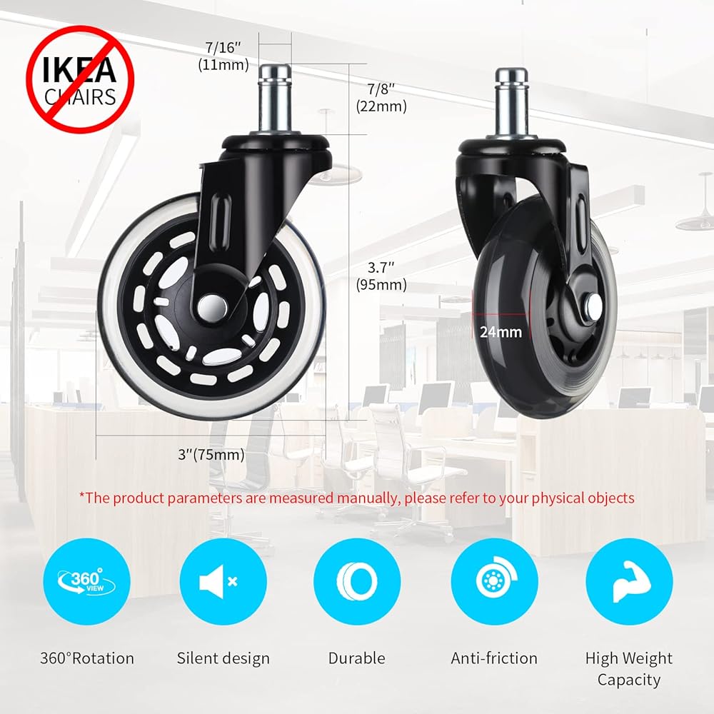 【الحجم العام】تناسب عجلات كراسي المكتب لدينا أكثر من 98% من عجلات كراسي المكتب في السوق (مقاس 7/16 بوصة × 7/8 بوصة أو 11 مم × 22 مم). عجلات الكرسي غير متوافقة مع كراسي ايكيا. سنرد لك كامل المبلغ في حالة عدم التوافق الناتج عن بعض الأسباب الخاصة