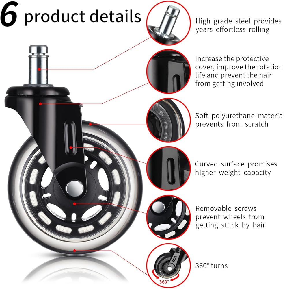 【قوية ومتينة】 تعتمد عجلات كراسي المكتب عالية التحمل لدينا على قضبان فولاذية صلبة صناعية وإطارات عجلات سرعة كرسي المكتب مع قواعد سميكة وحوامل لزيادة جاذبية تحمل الكرسي. محمل مزدوج دقيق مدمج من الفولاذ عالي الكربون يوفر لك دورانًا سلسًا دون تأخير للاستمتاع بمتعة الانزلاق. تعمل مواد البولي يوريثين بشكل أكثر مقاومة للاهتراء ومتينة لدعم وزن 650 رطلاً.