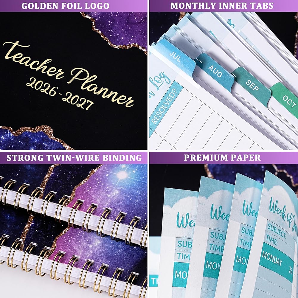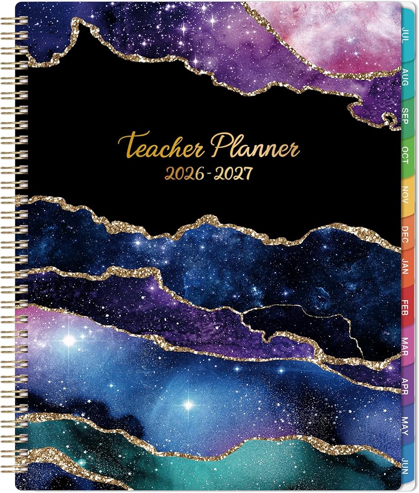 مخطط المعلم 2026-2027، كتاب خطة الدرس 2026-2027، يوليو 2026 - يونيو 2027، كتاب خطة درس المعلم، مخطط أكاديمي للجداول المدرسية، 8.5 بوصة × 11 بوصة، علامات تبويب شهرية ملونة، جيب خلفي