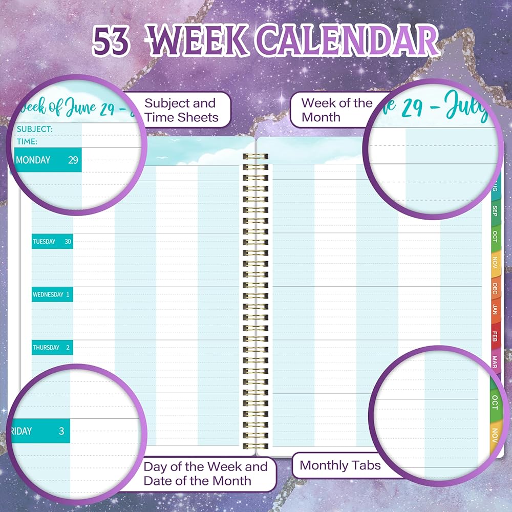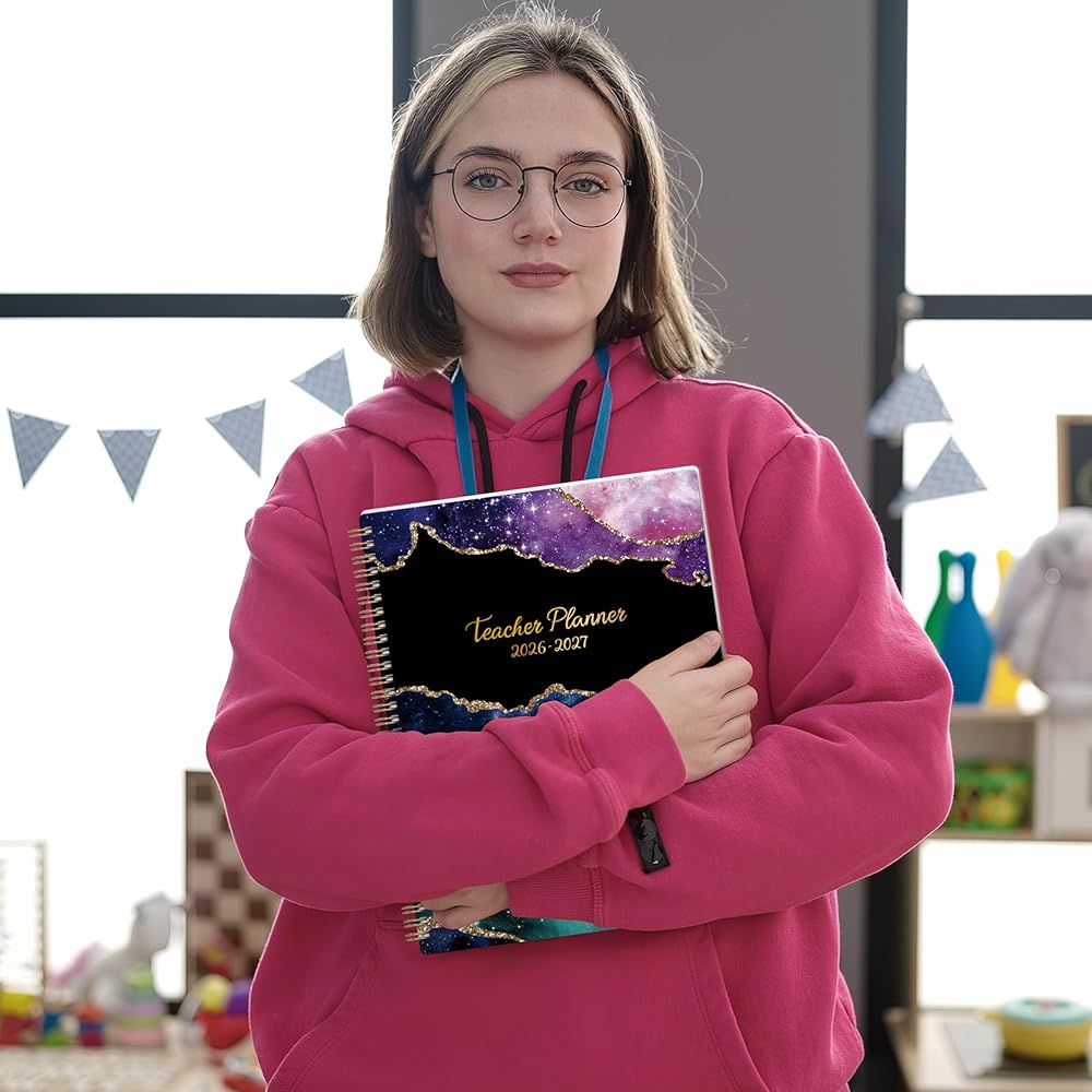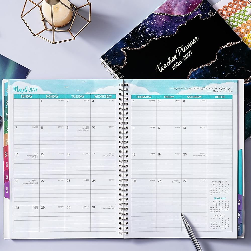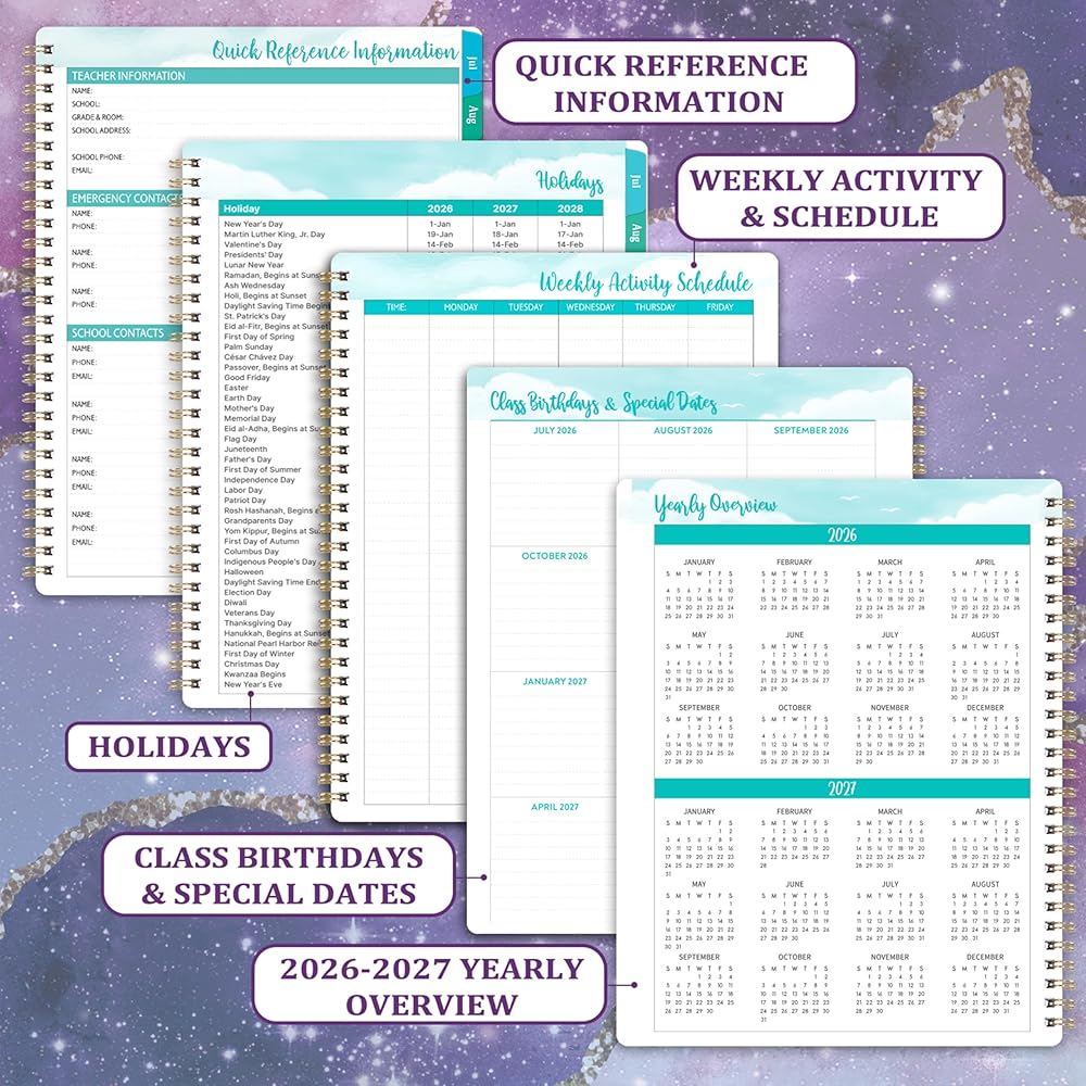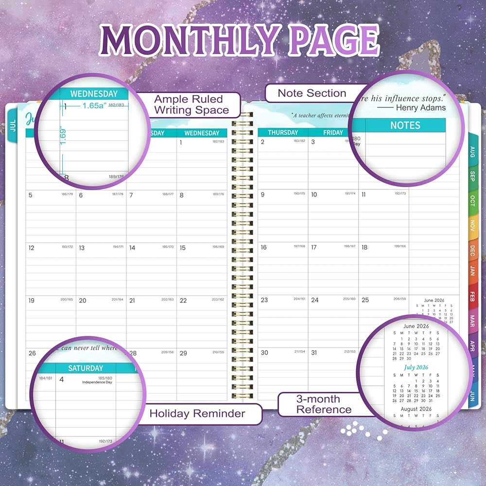 كتاب مخطط الدرس - يتيح لك التقويمات المرجعية السابقة ، الحالية ، الشهر المقبل في كل صفحة عرض شهرية ، وحساب الأيام الماضية والرياح ، رؤية واسعة على مدار العام. علاوة على ذلك ، تحتوي صفحات العرض الشهرية على عطلات رئيسية ملحوظة ، ومساحة كتابة واسعة ، وأقسام الملاحظات والاقتباسات الملهمة.