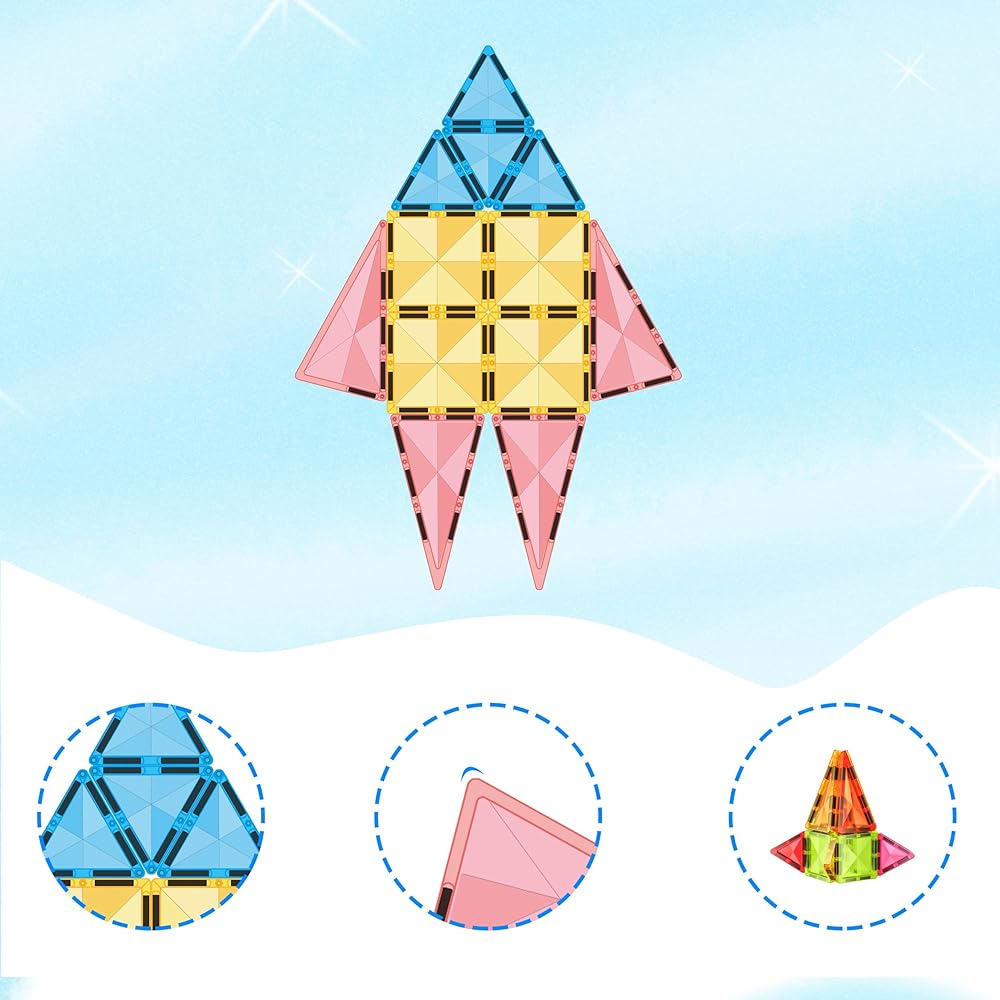 EDUCATIONAL PLAY: This magnet building block is designed to fuse STEAM learning with fun. As kids dive into connecting and experimenting with these magnetized tiles, they embark on an exploration of essential concepts in problem-solving, geometry, and spatial awareness. It's education in action, where every magnetic click sparks a new idea. When it's time to wind down, children can practice their organizational skills by neatly stashing their toy parts back in the provided drawstring bag.