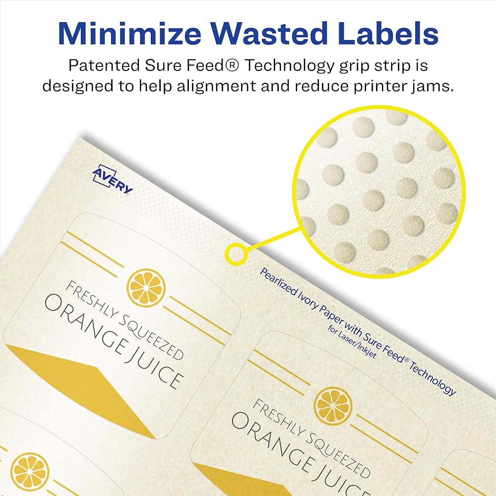 - Avery labels with patented Sure Feed technology provide a more reliable feed through your printer, reducing misalignments and jams
