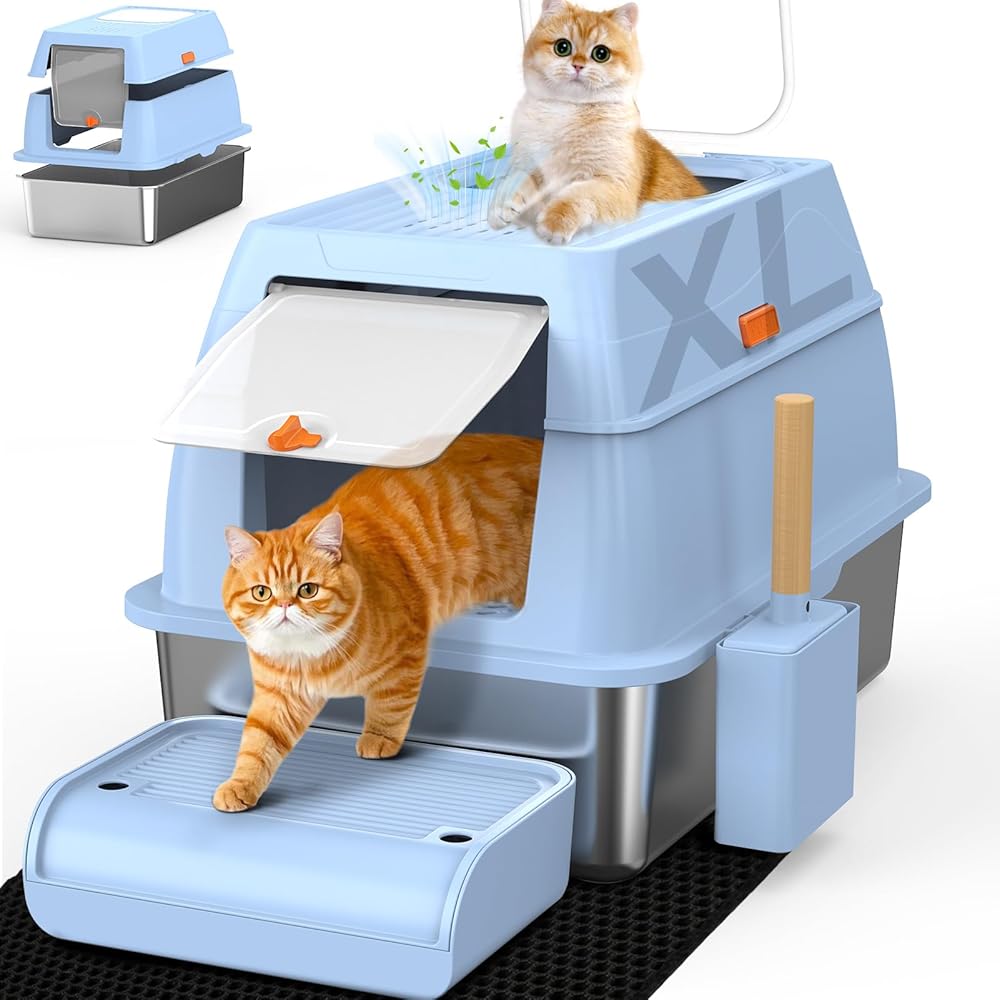 SZEE Large Stainless Steel Litter Box: The Ultimate Solution for a Clean and Fresh Cat Space Keep your cat's litter box clean and odor-free with the SZEE Large Stainless Steel Litter Box, designed for both functionality and convenience. Crafted from durable, scratch-resistant stainless steel, this metal litter box offers exceptional durability and is incredibly easy to clean with just a simple wipe. The smooth surface prevents dirt from getting trapped, reducing odor buildup and ensuring your home stays fresh. Thoughtful Design for Easy Use and Minimal Mess The guided entry and exit design of this cat litter box helps keep your home tidy by preventing litter from being tracked outside. Cats enter through the front and exit via the top, which significantly reduces cleaning work. No more worrying about litter scattering around your cat's litter area! For your convenience, you can also opt to use it as a standard cat litter box with front entry and exit if that's more suitable for your cat's habits. Effective Odor Control for a Fresh Environment With the fully enclosed design, odors are locked inside the box, minimizing unpleasant smells in your home. Additionally, the top of the box includes a dedicated space for activated charcoal, allowing you to further enhance odor control. Whether you have one cat or multiple, this feature will help keep your living space fresh and free from unwanted odors. Perfect Size for Cats of All Sizes This large litter box is designed with a 24" x 16" x 6" frame and a 10" lid height, making it spacious enough for even larger cats, including those up to 15 lbs. Whether you have a small or large breed, your cat will enjoy plenty of room to move around comfortably in this roomy litter box. Versatile Usage Modes for Your Cat's Needs The SZEE Large Stainless Steel Litter Box offers flexibility with two usage modes: fully enclosed or semi-enclosed. You can easily switch between these modes depending on your cat's preference. Choose the fully enclosed mode for optimal odor control and a more contained litter space, or switch to semi-enclosed for easy access while still maintaining a clean environment. Plus, with two entry/exit options (front door only or front door with top exit), you can customize the setup to best suit your cat's natural behavior. Bonus Accessories Included To make your life even easier, this cat litter box comes with a trapping box to reduce litter scatter, and a litter scoop for easy cleanup. These added accessories ensure that maintaining your cat's litter box remains a simple task, while minimizing the mess around the litter area.