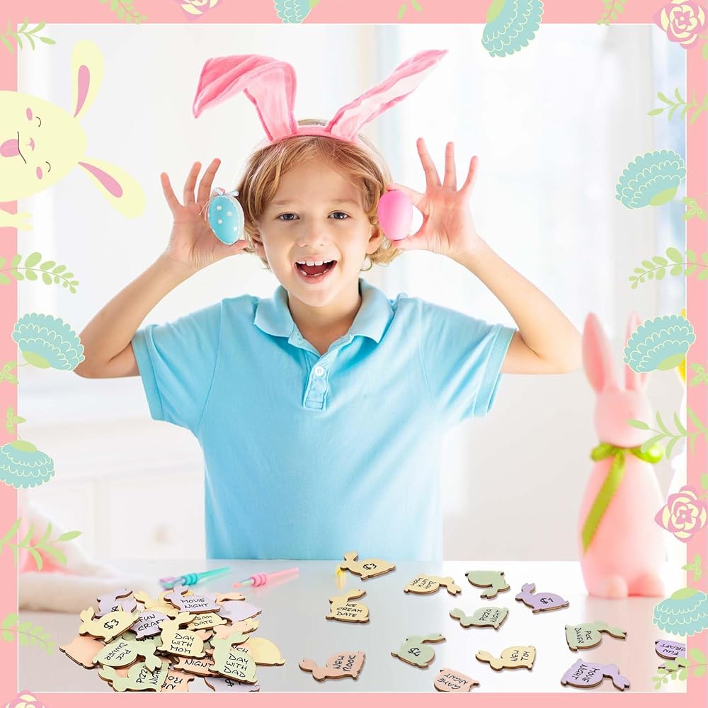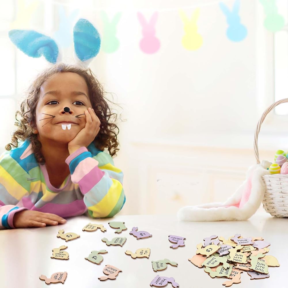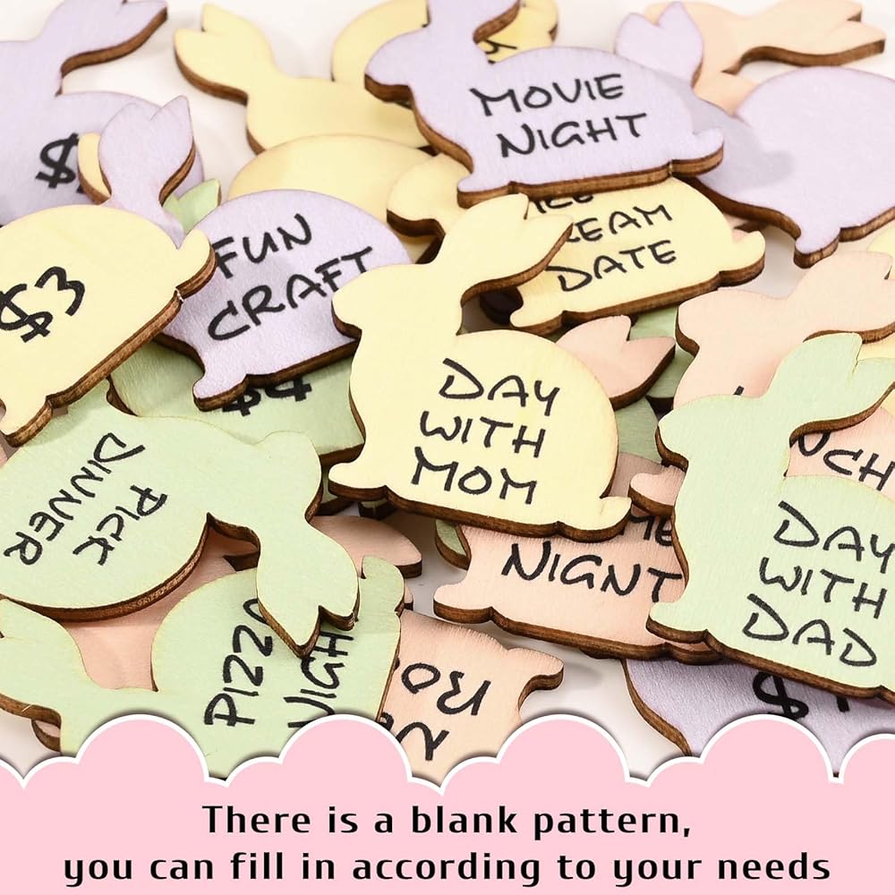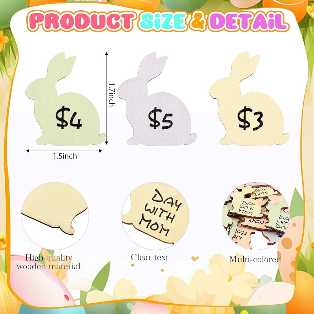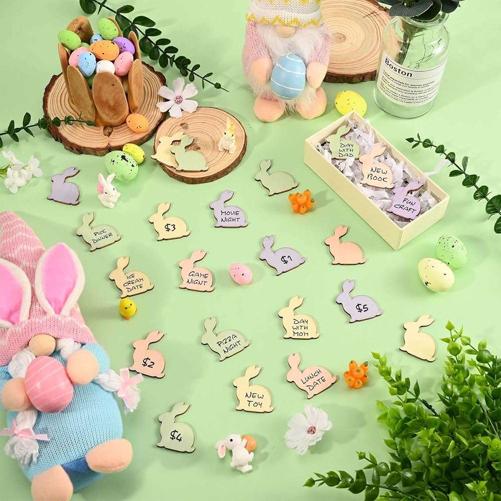 24 Pcs Easter Tokens Easter Reward Egg Fillers Bunny Wood Basket Egg Tokens for Easter Day Party Favors Craft Decoration