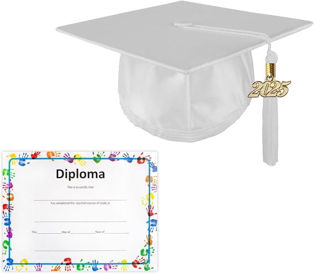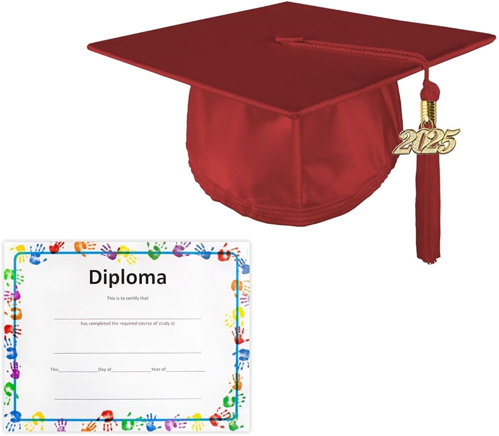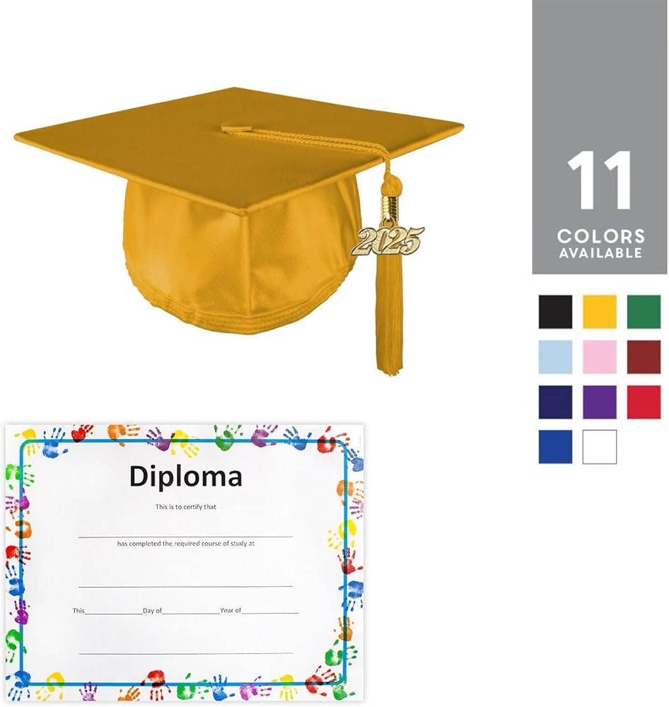 Class Act Graduation wants to make sure you celebrate in style and create a memory that lasts a lifetime. Cap has a spot inside for you to write your name inside so when you toss it up, you can find YOUR cap. We offer over 100+ solid or multi-color tassels that are designed to be worn with your cap and gown during the ceremony as well as commemorative keepsakes for memorabilia or souvenirs!Shiny Cap Features:• 100% Polyester Shiny Finish Fabric• Easy Tassel Application• 7.75" by 7.75" Mortar Board• Featured with Elastic Band• One Size Fits Most childrenTassel Features:• 100% Rayon• 6" Fringe Tassel• 6" Hang Loop• 65 Strand Count• Matches cap color• Easy to ApplicateCharm Features:• 2025 Year Charm• Removable• Gold Zinc Alloy• 4-digits• 0.375" x 0.5" ClaspCertificate Features:• 8.5" x 11" frameable certificate• Colored border• A perfect keepsake to remember your kindergartener's special day!How to Wear a Tassel1. Remove tassel from protective sleeve and smooth out any tangled strings.2. Secure the loop of tassel onto the button located at the center top part of the mortarboard.3. Tug on the tassel gently to make sure it's properly secured under the button.Tip: Arrange tassel to the right side. Do not move the tassel to the left side until after you are officially declared a graduate!