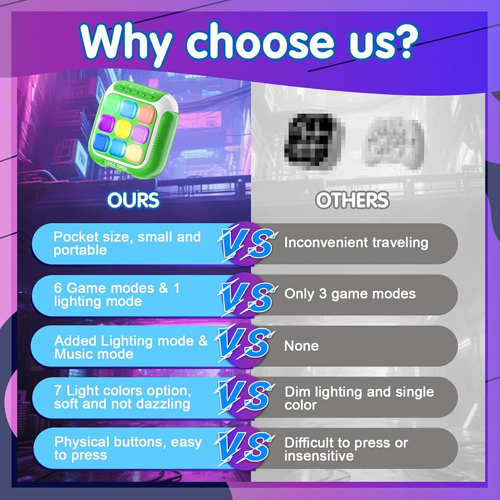 اضغط على اللعبة مع 7 أوضاع-بما في ذلك 6 أوضاع للألعاب (وضع TIC-TAC-TOE ، وضع AI TIC-TAC-TOE ، وضع Whack-A-Mole ، وضع الذاكرة ، وضع الموسيقى ، وضع المطاردة) ووضع الإضاءة 1 (مع 11 نوعًا من إيقاعات الإضاءة). طريقة اللعب الأكثر إثارة للاهتمام وتنوعًا ، دع أطفالك يفكرون بشكل إيجابي ويتفاعلون بسرعة في المستويات الصعبة وتركيز التمارين الرياضية والذاكرة والتفاعل والتنسيق اليدوي والقدرة العملية.