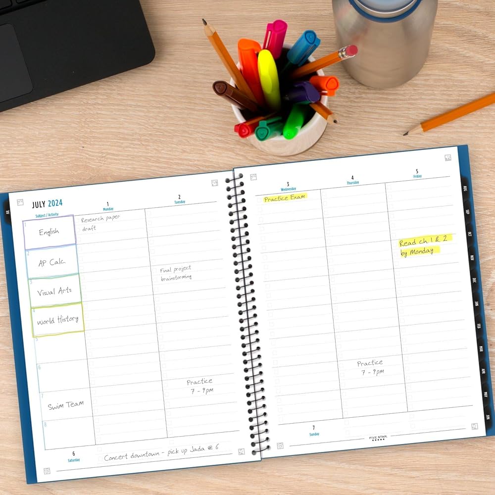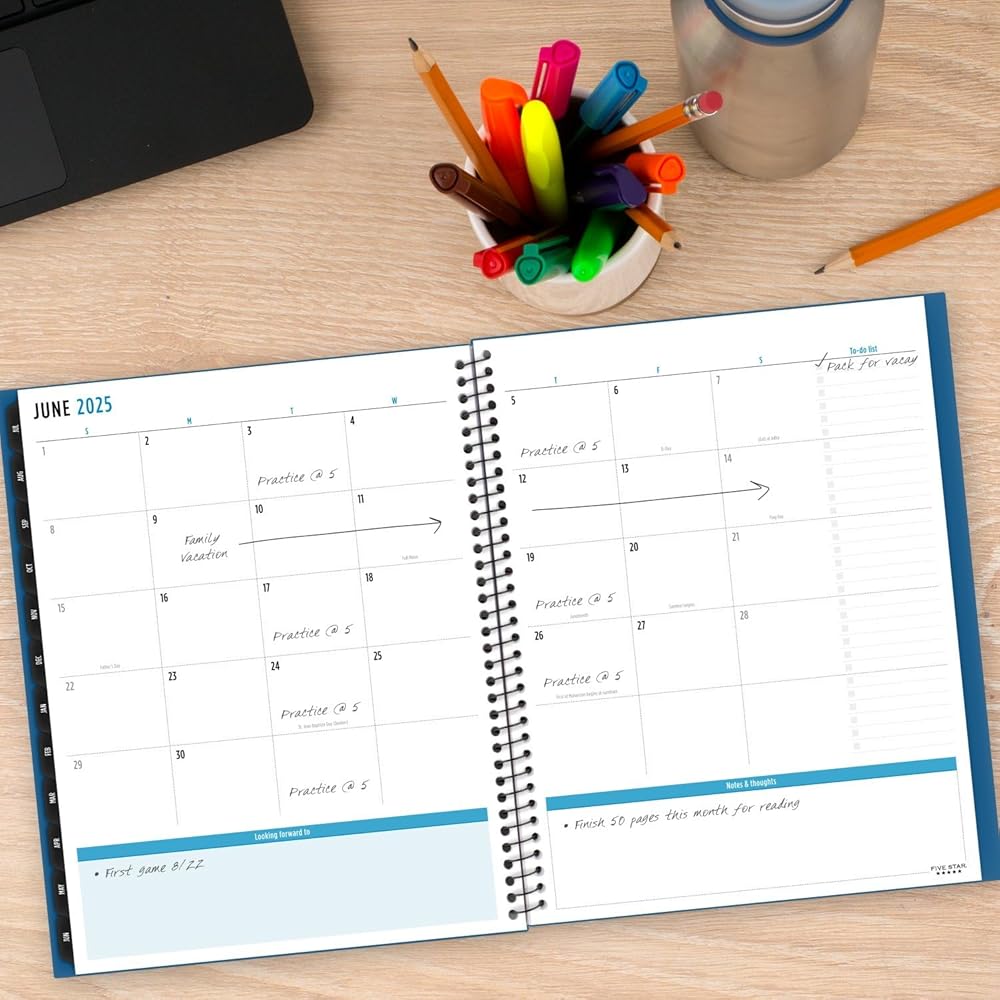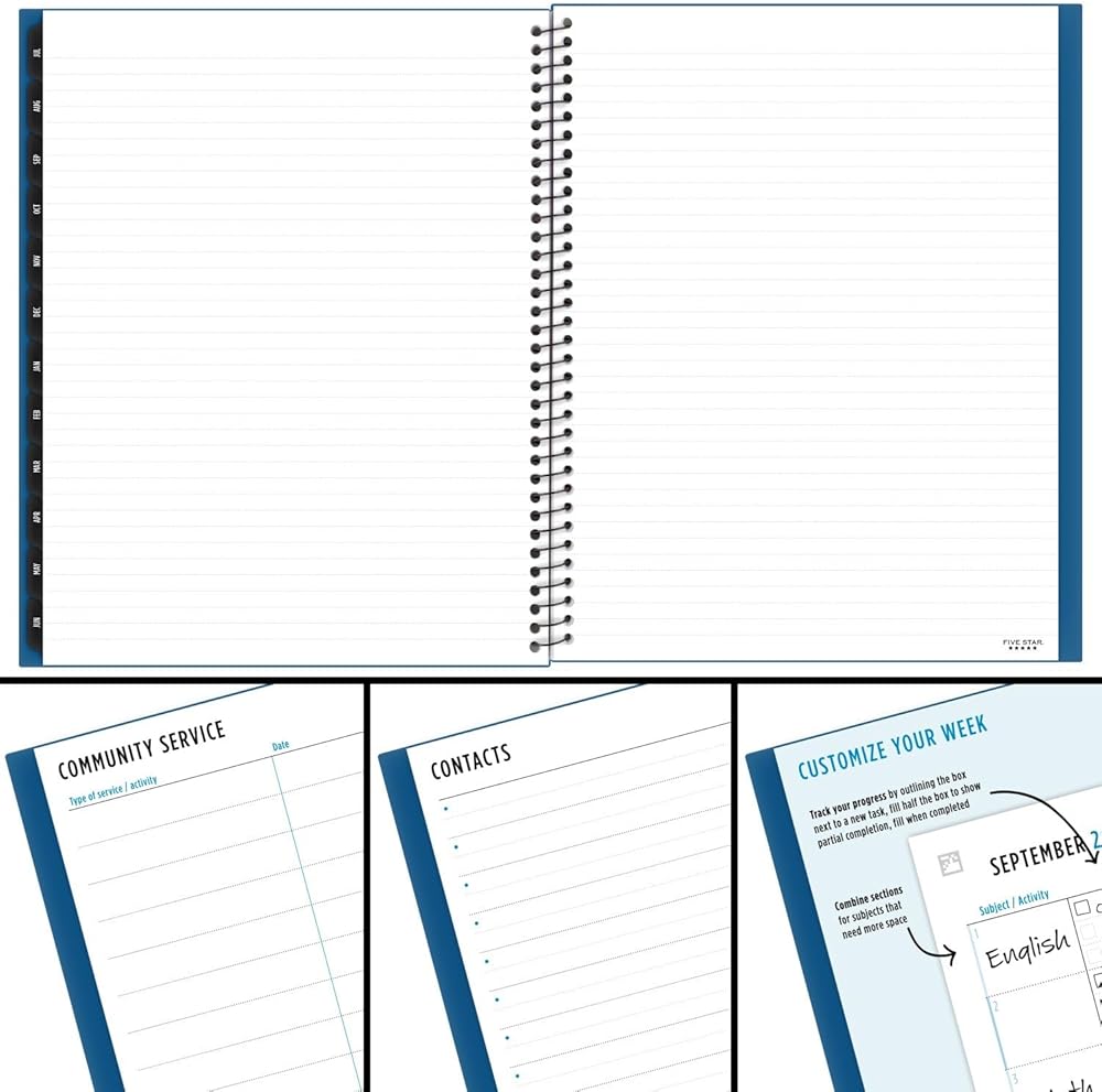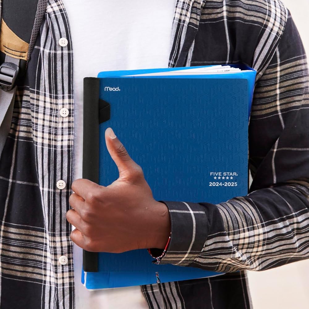 LASTS ALL YEAR. This Five Star Advance Student Academic Weekly Monthly Planner covers 12 months from July 2025 — June 2026 for academic year planning. Sync your planner to your phone with the Five Star Study App. Scan the planner pages to track and manage your assignments to access them anywhere, anytime. Weekly spreads have space to track up to 8 subjects and check boxes to mark off priorities. Pages measure 8.5" x 11". Tabbed monthly spreads have open daily blocks, a to-do list with check boxes and a notes section. Special pages include a 2-year reference calendar, 2 community service pages, 2 contact pages, 5 notes pages, a storage pocket and a pen loop to hold your favorite pen or pencil. Spiral Guard covers the wire to help prevent snags on clothes and backpacks. Thick, durable cover has trapezoid texture and is available in Black. *Guarantee is valid for one year from purchase or delivery date, whichever is longer. Does not cover misuse.