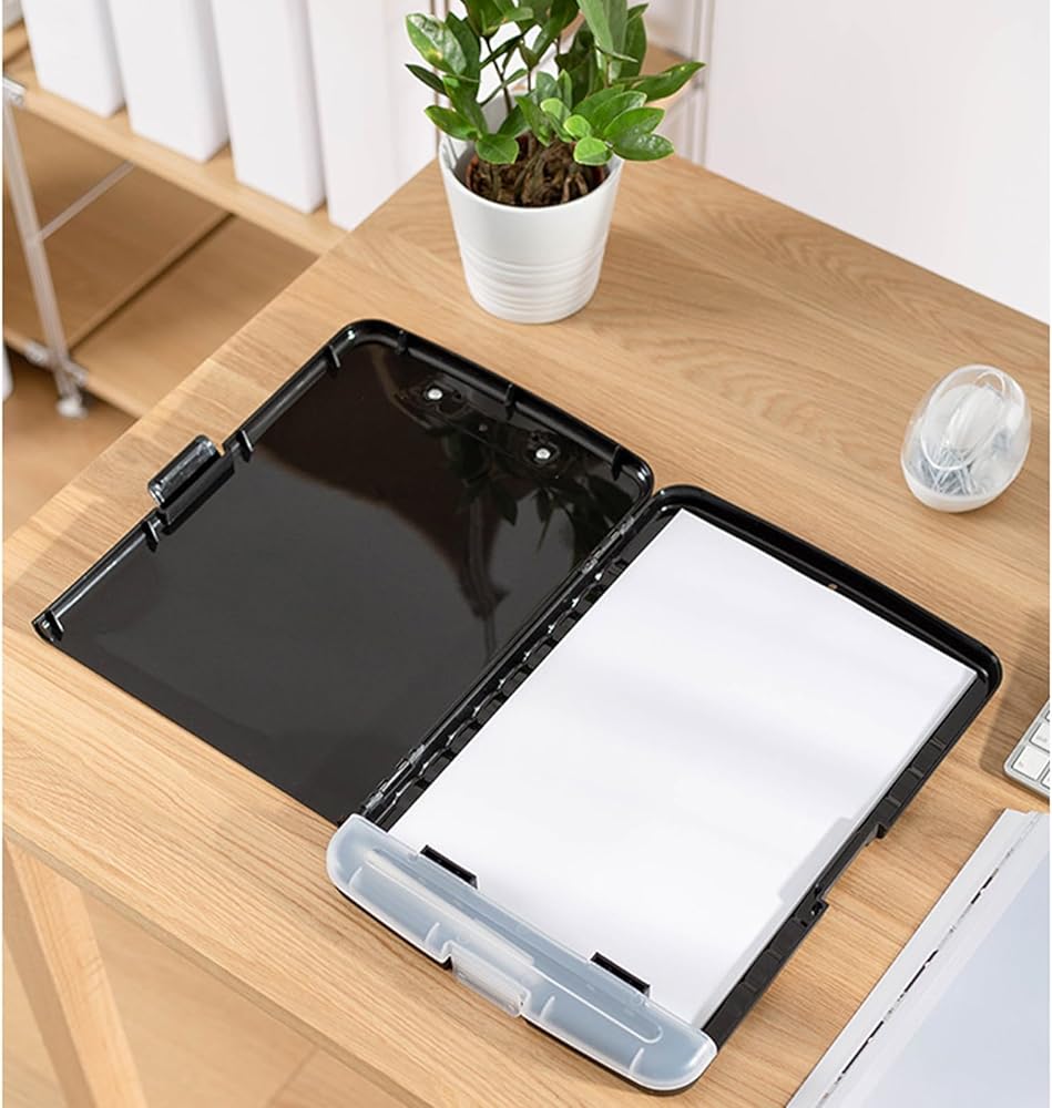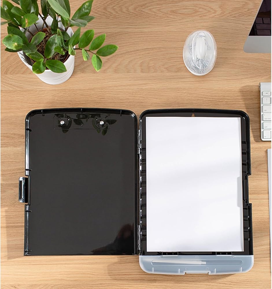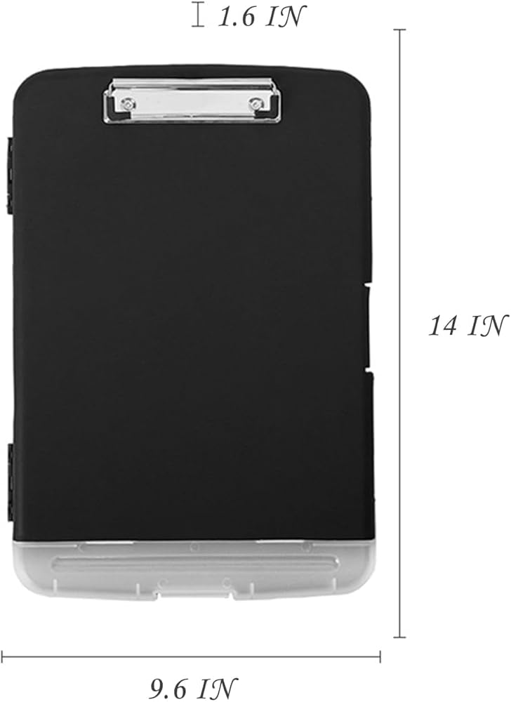• 【14” x 10” Clipboard with Storage】 The snap closure keeps your documents from falling out and easy to open up with one hand. The metal low-profile clip provides a strong grip. There is a hole on the back that enables you to hang the storage clipboard up and fits on a thumbtack.