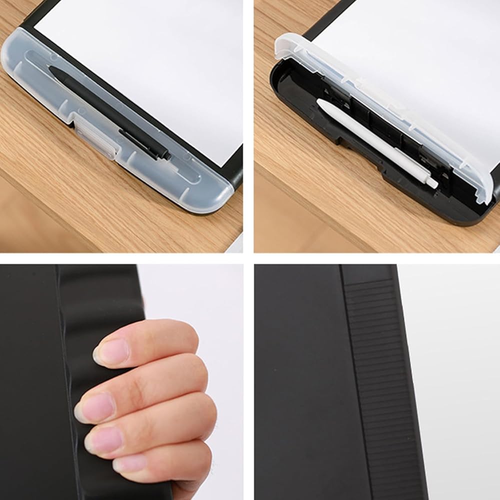 The clipboard with storage function can store many small stationery and electronic equipment. For example, pen, notepad, mobile phone, etc.