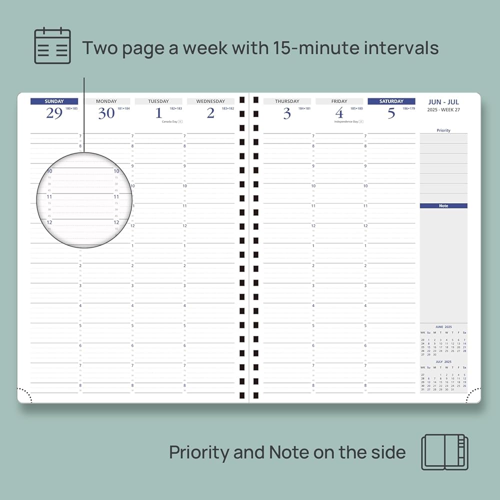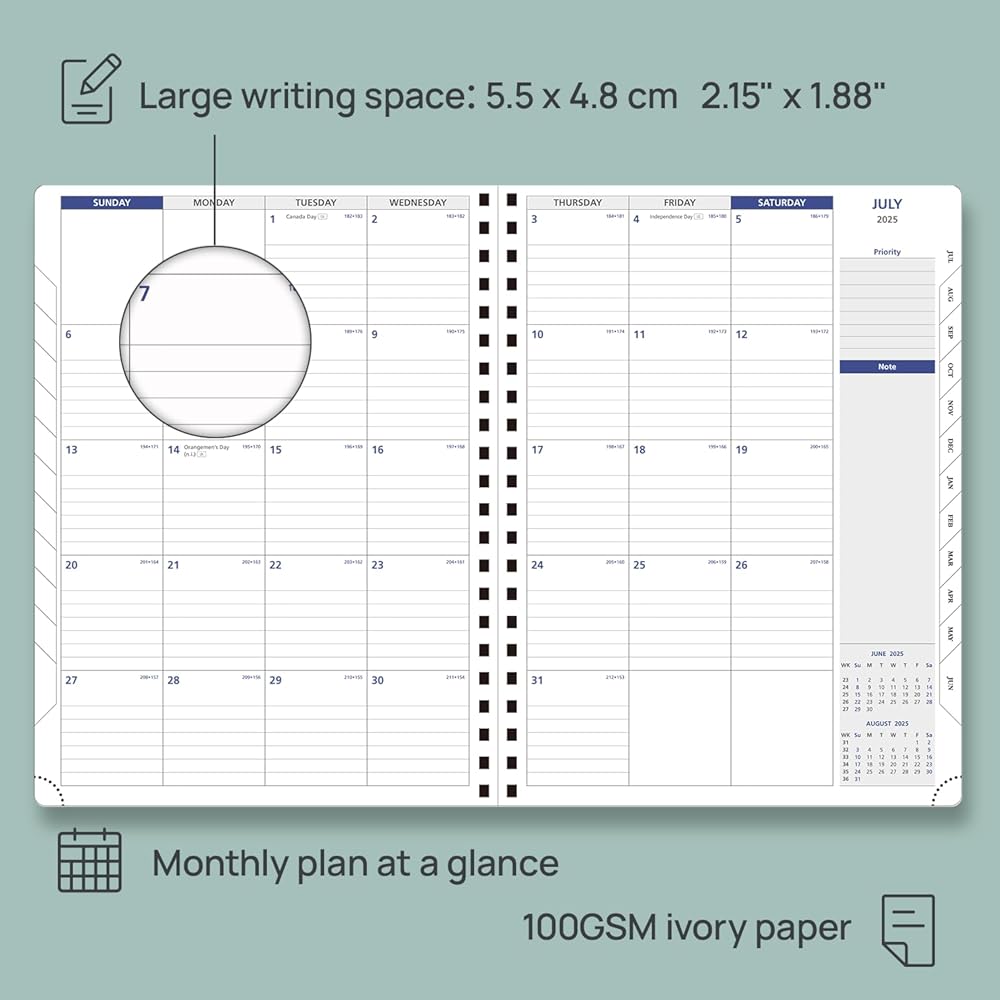 • صفحتان في الشهر: يقدم هذا المخطط الشهري 2025-2026 (يوليو 2025-يوليو 2026) تصميمًا فسيحًا وفريدًا يشبه التقويم ، كل شهر له صفحتين من بين صفحتين مع ملاحظات منتشرة ومبطنة لمساعدتك في إدارة المواعيد النهائية والأهداف بفعالية.