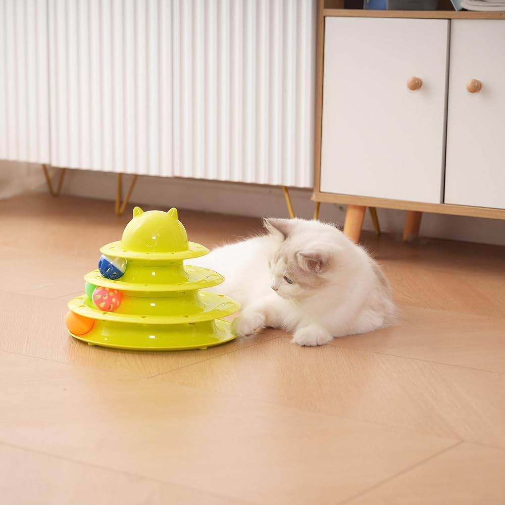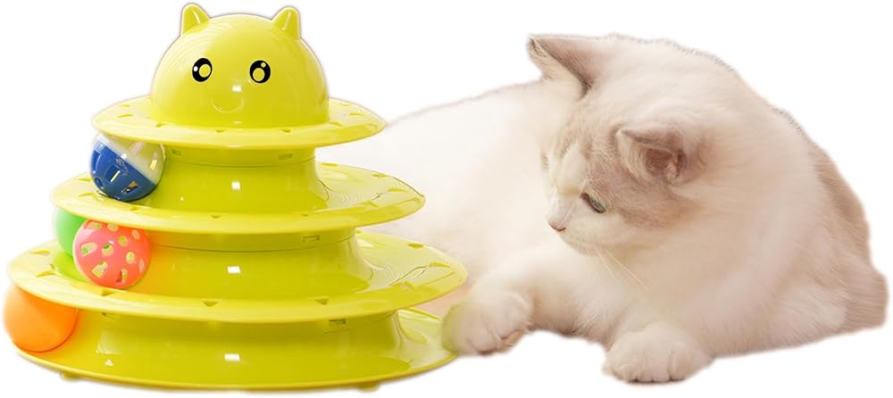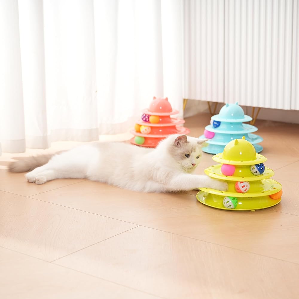 1.Type : This Catstages Tower Track Toy is an interactive cat toy designed to stimulate your cat's natural hunting instincts through movement, sound, and engaging play. 2. Design: Multi-Level Tracks - 3-Tiers of circular tracks for balls to roll around Rolling Balls - Includes lightweight, rolling balls to attract cats attention Stable Base - Non-slip bottom to prevent tipping during vigorous play 3.Materials: Base & Tracks - Durable, lightweight Polypropylene Balls - Plastic with sound element 4.Benefit for Cats: Mental Stimulation - Engages curiosity and hunting instincts Stress Relief - Help anxious or bored cats by providing great entertainment 5.Cleaning & Maintenance: Wipe with a damp cloth ( avoid harsh chemicals ) Remove fur or hair from tracks regularly