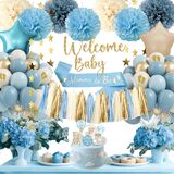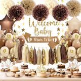 مرحبًا بيبي: ضع لهجة دافئة وجذابة للاحتفال الخاص بك مع لافتة "Welcome Baby" و Topper Cake ، مما يخلق جوًا مليئًا بالتوقع والفرح. ترمز البالونات الخضراء الحكيمة إلى النمو والتجديد ووعد الحياة الجديدة ، في حين تضيف البالونات البيضاء العاجية لمسة ناعمة وأنيقة ، مما يخلق جوًا هادئًا ومبهجًا لكل من الحفلات الطفلية والطفلة.