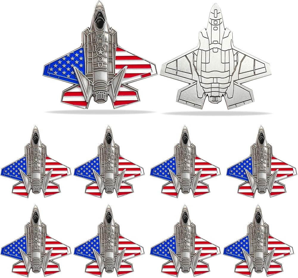 F-35 Military Coin Front: A American Flag F-35 Fighter Pattern مع ألوان زاهية. يتم دمج شكل المقاتل مع خطوط الولايات المتحدة الحمراء والأبيض والزرقاء ، والتي تظهر الوطنية وروح القوات الجوية. الظهر هو مخطط بسيط للمقاتل ، ويقدم تصميمًا فضيًا بسيطًا ، ويسلط الضوء على قيمته الفريدة