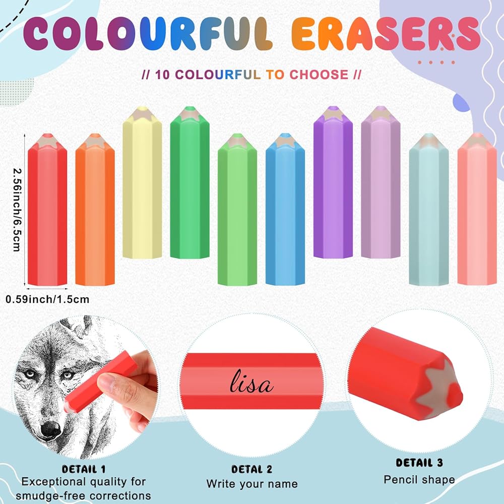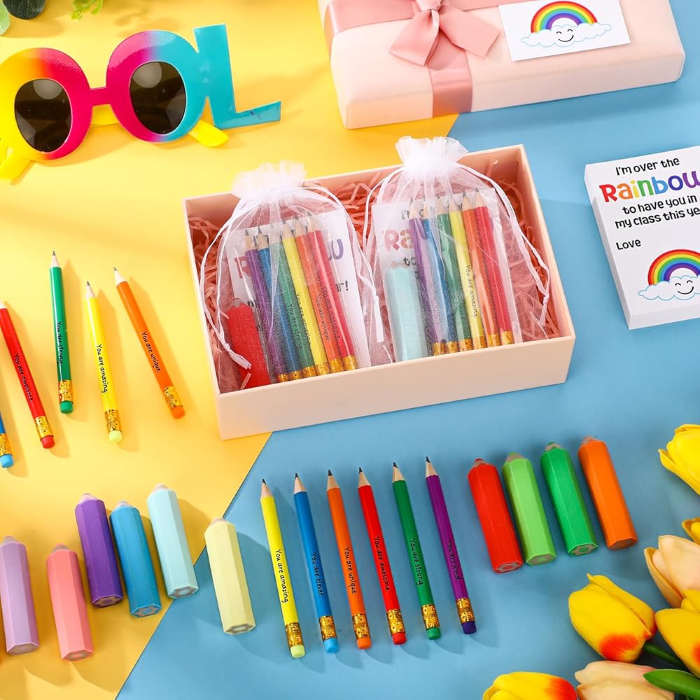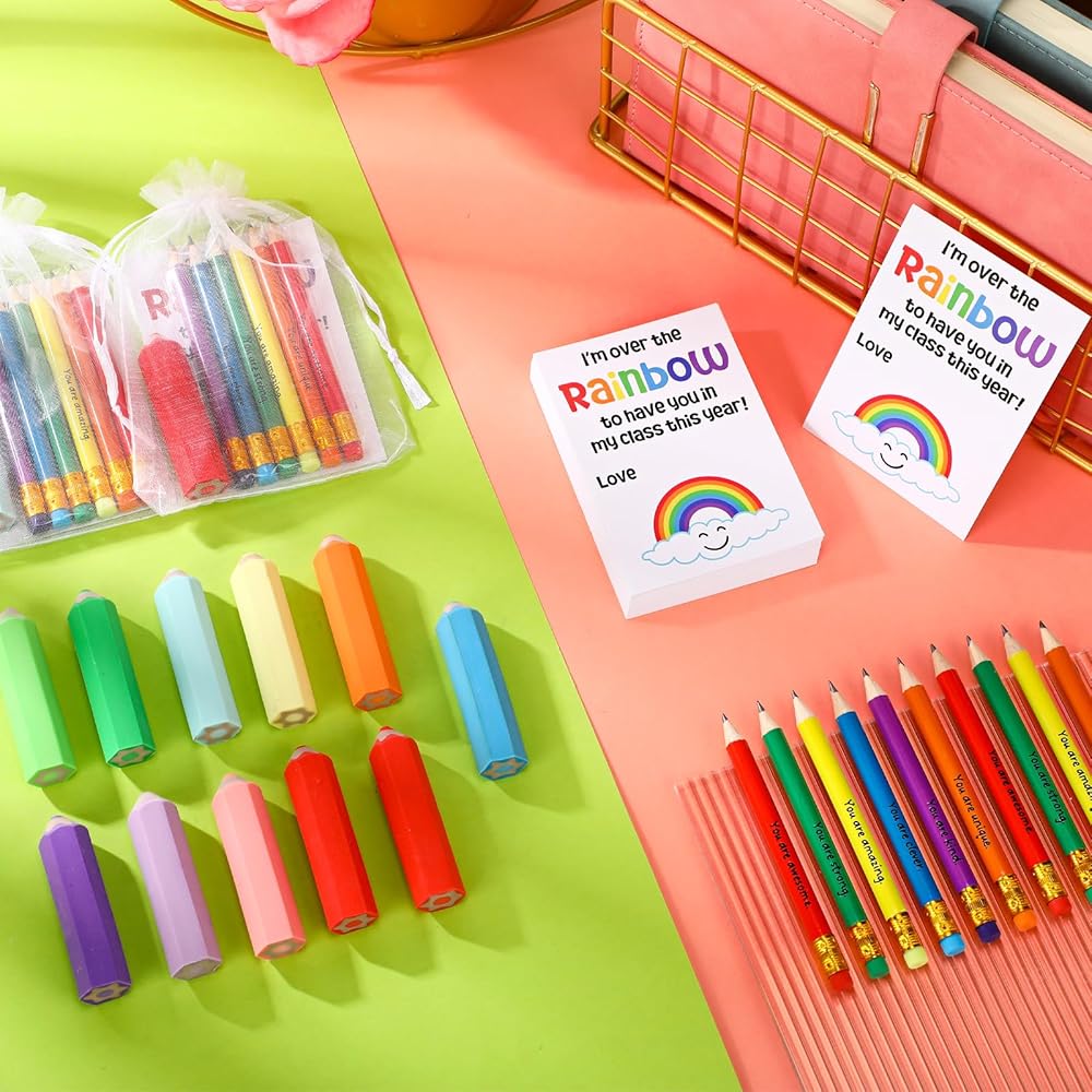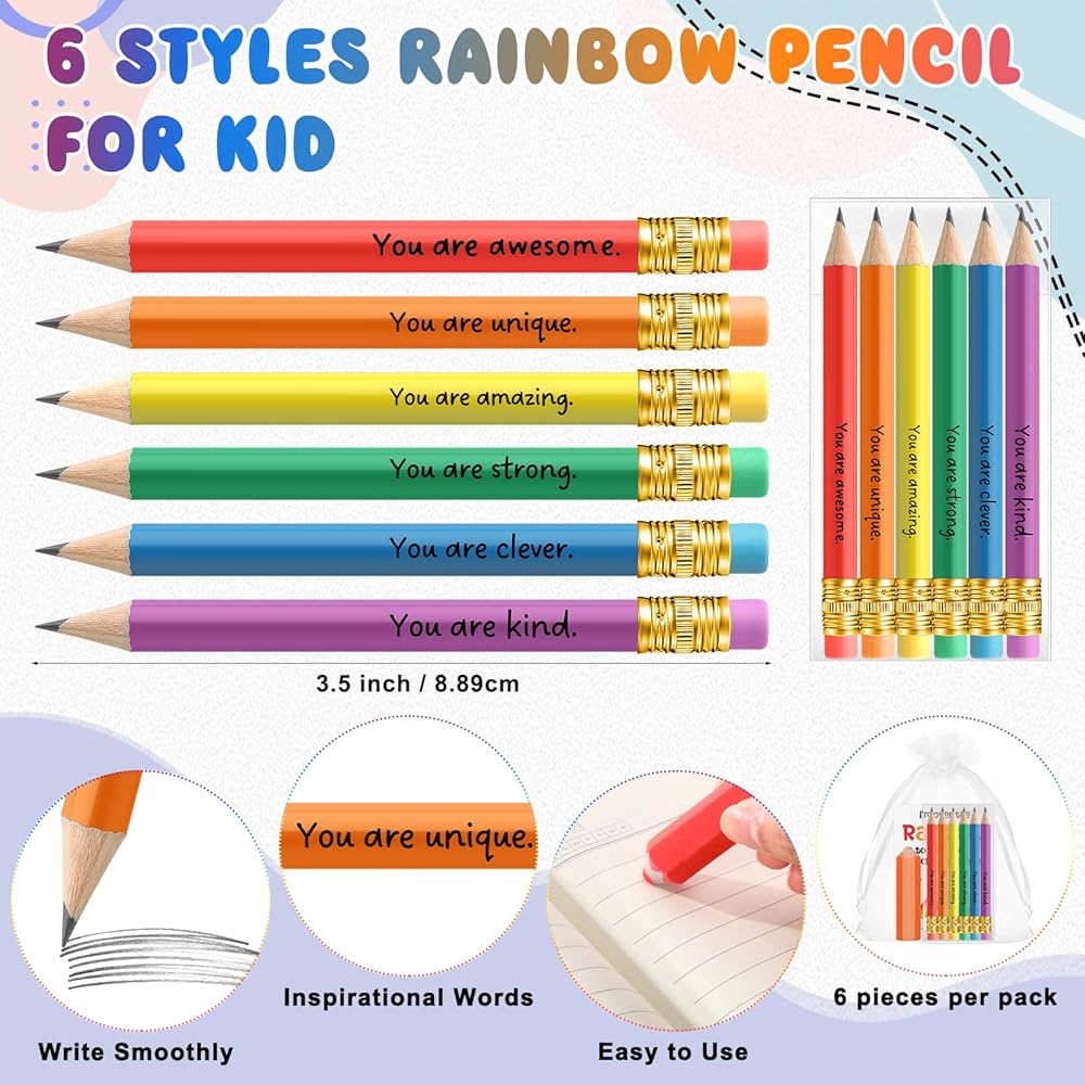 • Durable and Adorable: each rainbow pencil is crafted from sturdy wood with a comfortable grip; The pencil-shaped erasers are made from TPR, blending cute design with practicality; The cards, printed on coated paper with warm words, are suit for classroom rewards, gifts, or daily fun