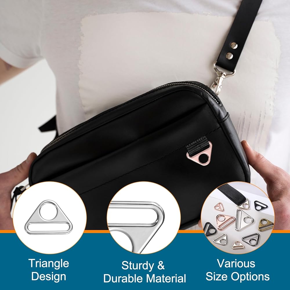 • Wide Application: This classic triangular D-ring buckle is versatile. It can be attached to belts, webbing, backpacks, handbags, purses, shoulder bags, cross-body bags, or any bag strap. It can also be used as a keychain or for hanging crafts, DIY accessories, and decorations.