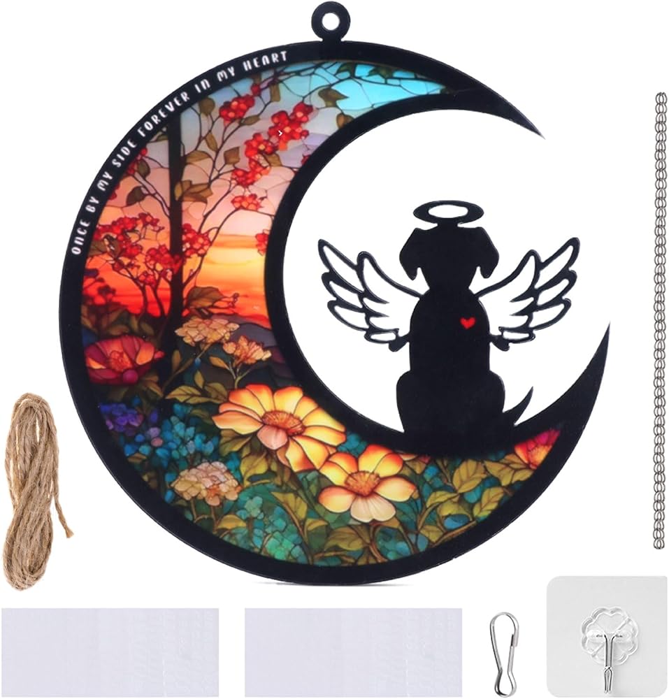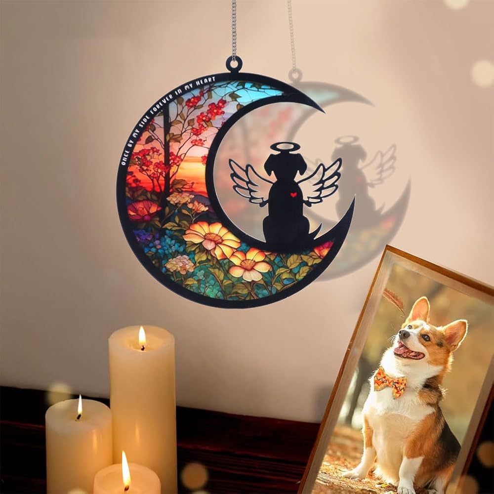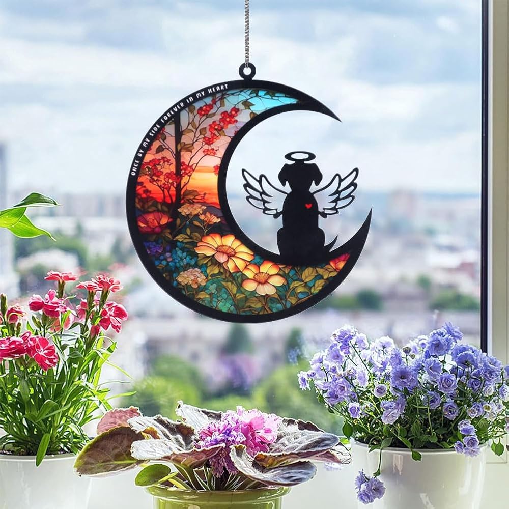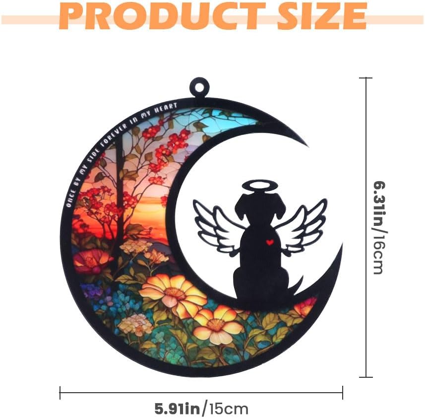 【DOG ANGEL DESIGN】This dog memorial hanging light catcher has bright colors, a cute dog angel sitting on the moon, with beautiful flower pattern, fine workmanship, perfect for home decoration, adding a warm atmosphere to your room.