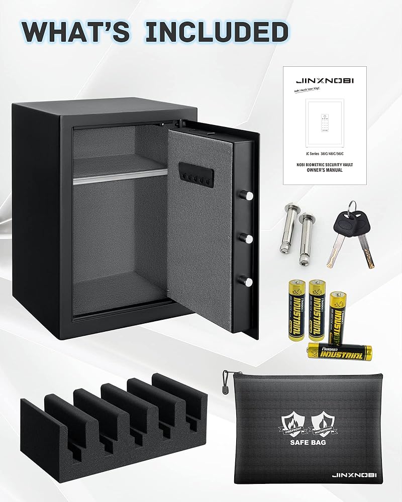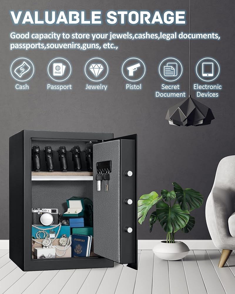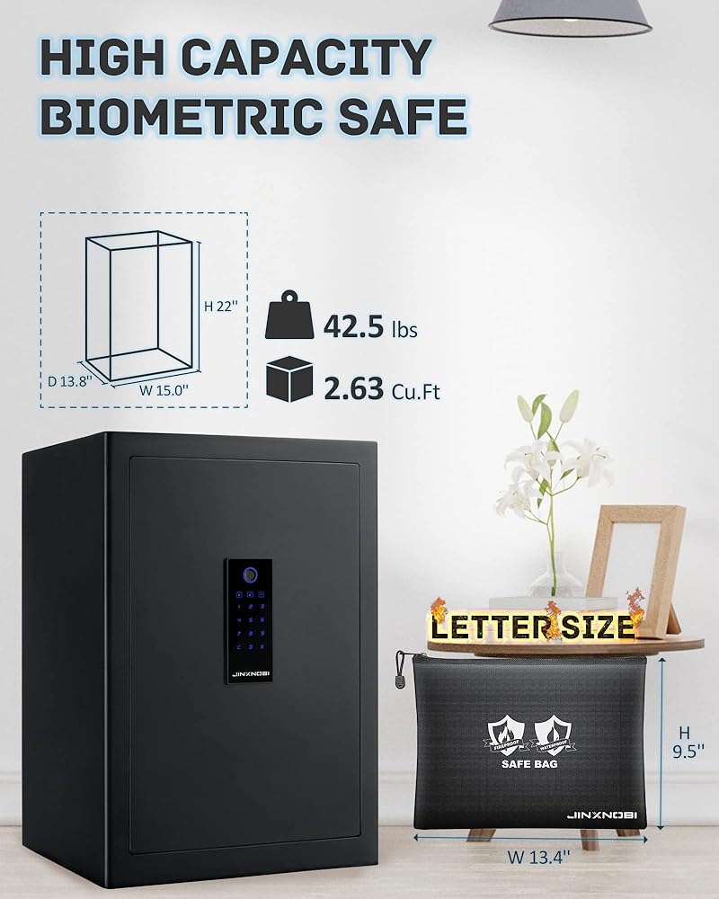 [2.19 Cu.ft Photeprint Fireproof Safe] هذا المربع الآمن بصمة البصمة البيومترية مع الحجم الخارجي: 18.9 × 15 '× 13.4' ، مرجح من 38 رطلاً ، ويشمل حجم الحرف مقاوم للمقاومة للماء ، لتأمين مستنداتك المهمة. 5 مسدسات تشكل رف بندقية في الداخل لعقد مسدسك. هذا المربع الآمن للأمان مثالي لتخزين المسدسات والنقد والملفات وبطاقات الائتمان وجواز السفر والطب وما إلى ذلك.