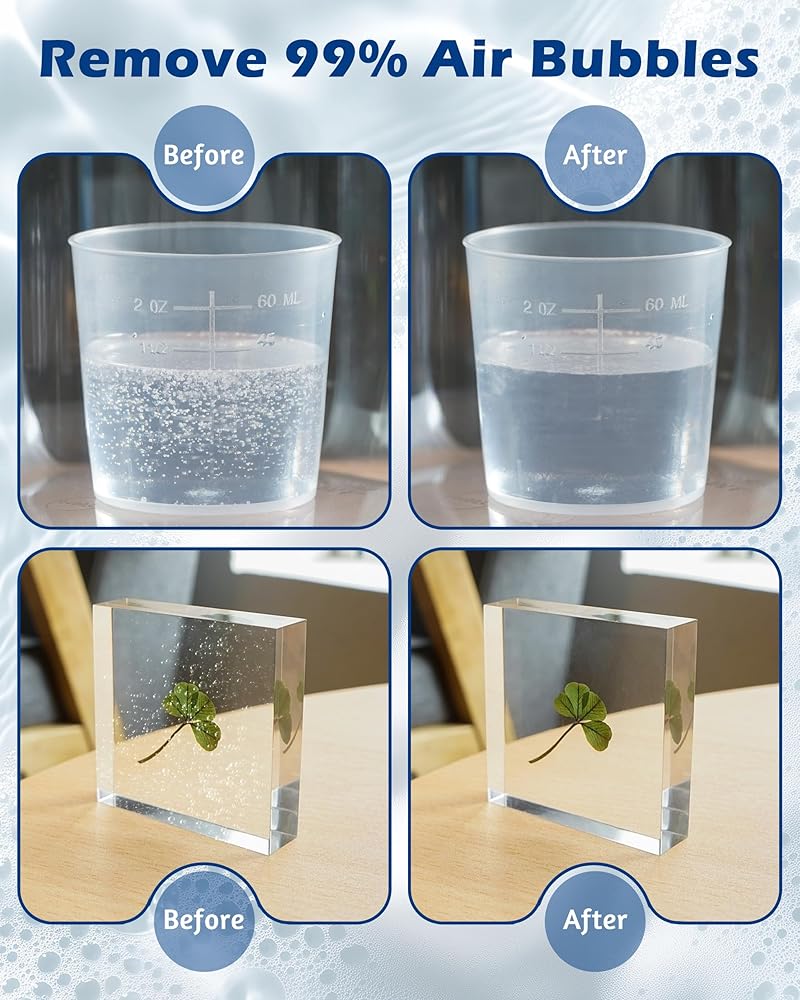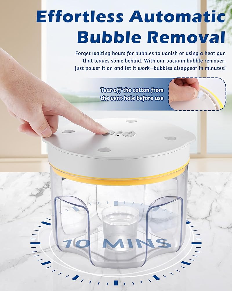 - سهل الاستخدام: ما عليك سوى وضع الراتنج الخاص بك ، واضغط على زر الطاقة ، ثم التحرير للحصول على نتائج خالية من الفقاعات بثواني