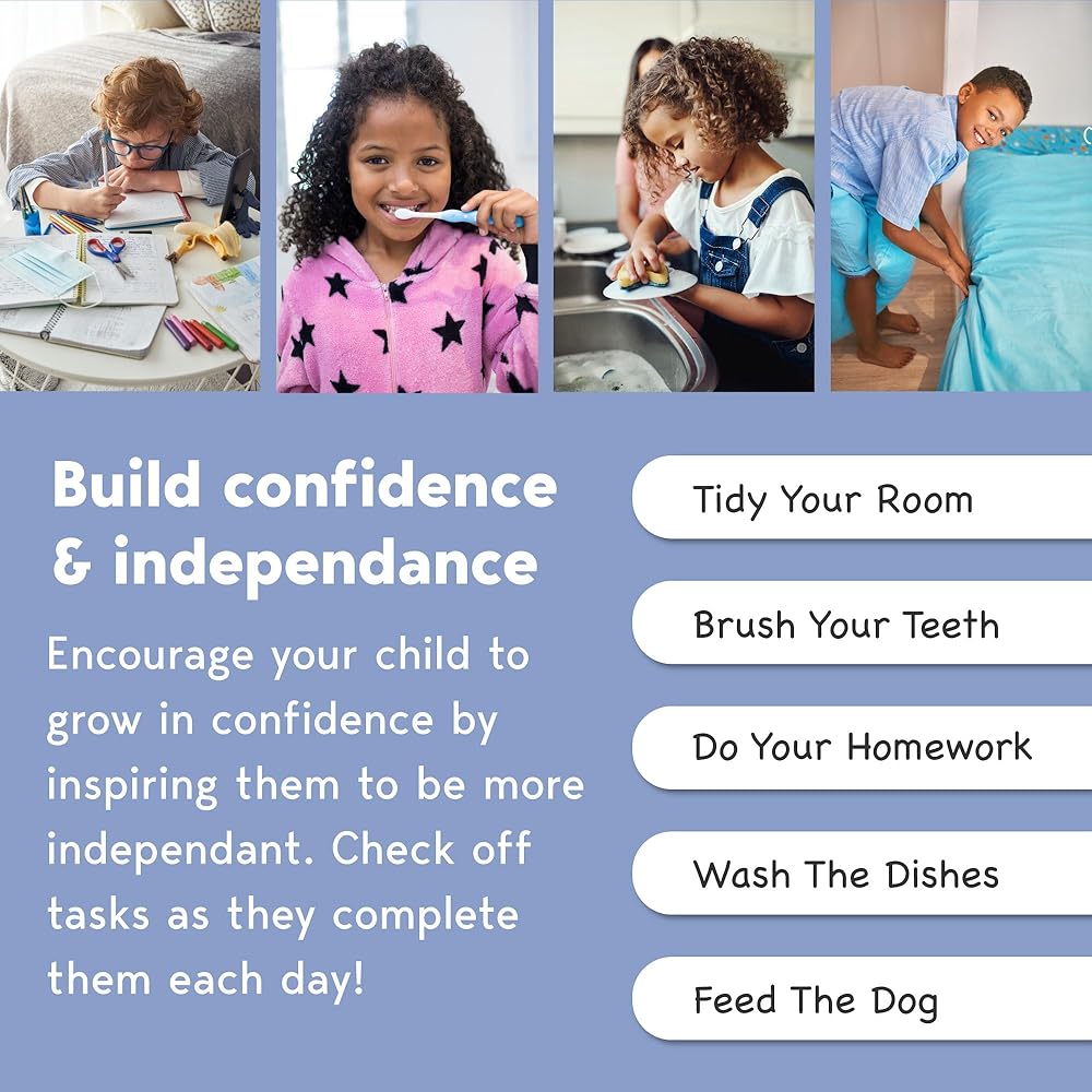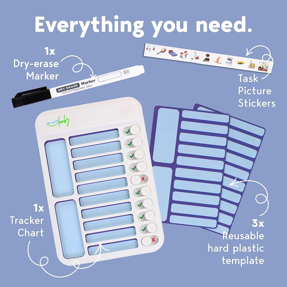 • تم تصميمه من أجل العقول المتنامية: مثالي كمخطط ADHD أو مخطط مكافأة الأطفال-يشمل 3 بطاقات قالب بلاستيكية قابلة لإعادة الاستخدام وعلامة الجفاف وملصقات الصور لكل من القراء وغير القارئين لتتبع المهام.