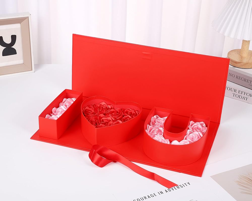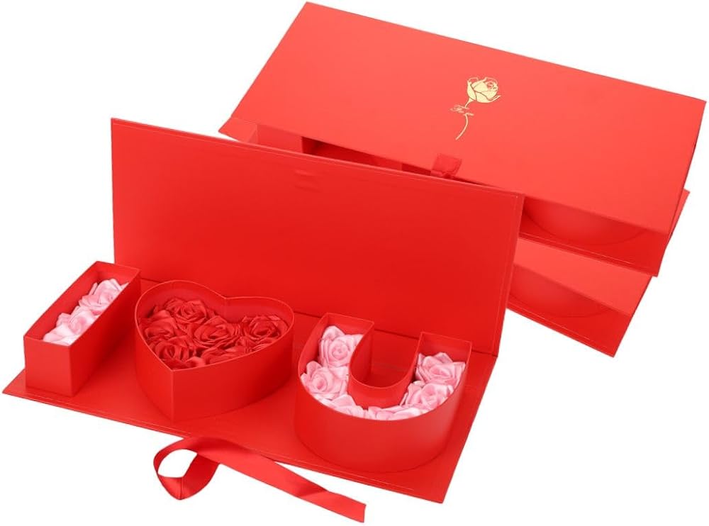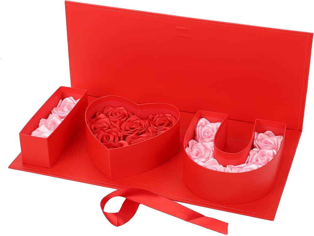 Introducing our versatile "I Heart U" gift box, crafted from durable hard cardboard and measuring approximately 18.0 x 7.7 x 2.7 inches. Available in five elegant colors—white, black, red, gold, and pink—this sturdy box is perfect for holding a variety of flowers and presents. Ideal for romantic occasions, it can be filled with roses, chocolates, cookies, cupcakes, strawberries, or small teddy bears, making it a thoughtful gift for Valentine's Day, Mother's Day, Christmas, anniversaries, and birthdays. With its lid and ribbon, this box is perfect for fresh floral arrangements, chocolate wrapping, bridesmaid gifts, Valentine's keepsakes, wedding party favors, bridal shower decorations, Halloween candy containers, and more. It serves as an excellent flower gift box for mom, keepsake box for girls, party favor container, baby shower gift box, personalized gift carton, preserved bouquet pack, real flower decor box, and home storage packaging. This empty, fillable gift box is ideal for holding jewelry, candy, roses, gift cards, small candles, mini cupcakes, necklaces, letters, and photos. Create personalized and unique decorative boxes for any occasion with a variety of flower colors, making your gift stand out for Valentine's Day, Mother's Day, or any celebration.