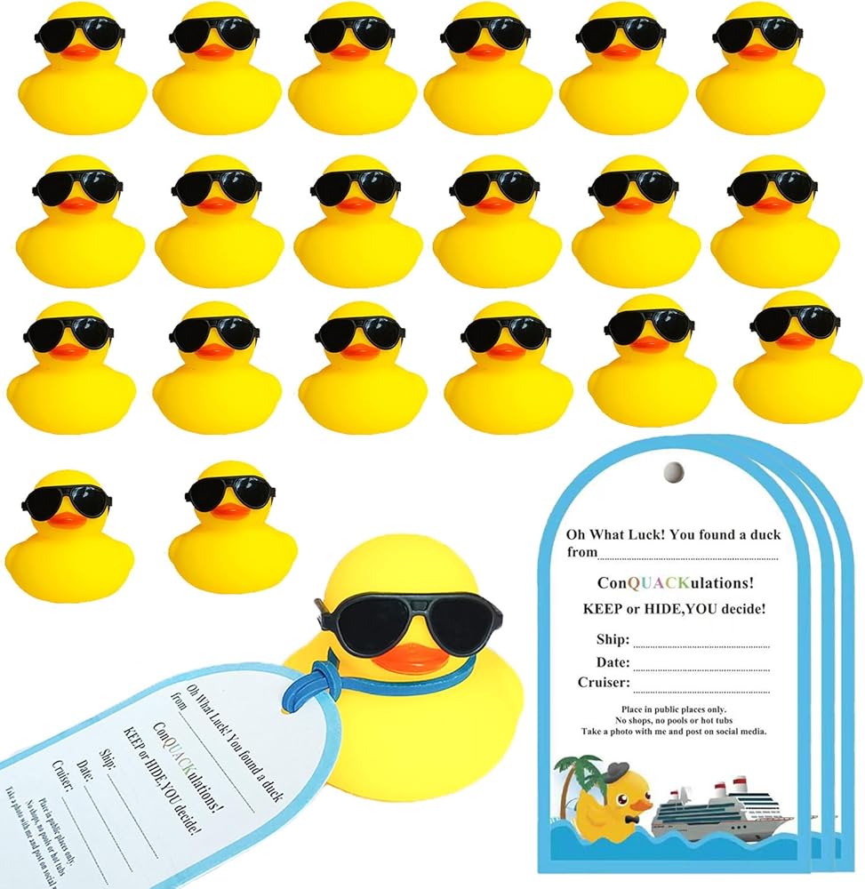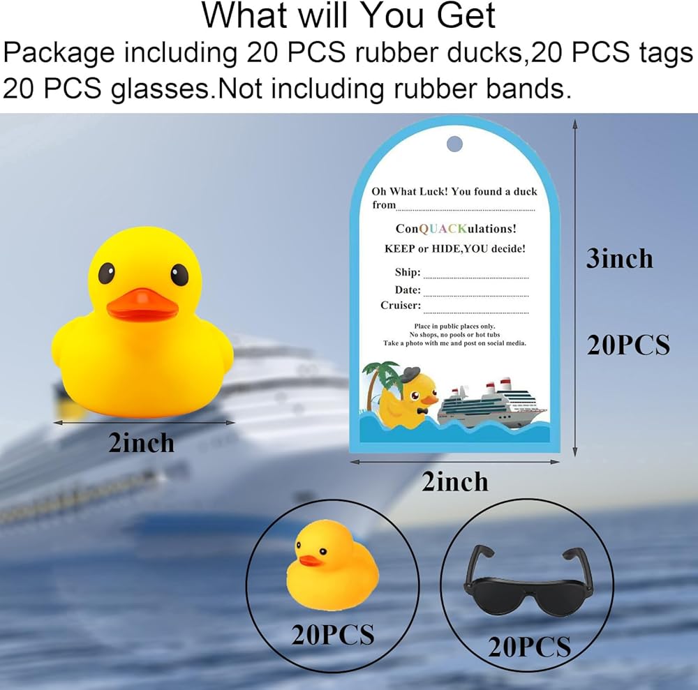 بط كروز قوي للاختباء مع العلامات، مجموعة 60 قطعة من بطاقات البط للرحلات البحرية، 20 بطاقة بطة، 20 بطة مطاطية و20 شريط مطاطي لكرنفال رويال كاريبيان ديزني أو أي سفن رحلات بحرية أخرى (نظارات)