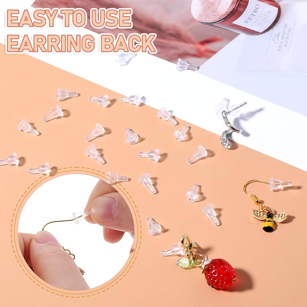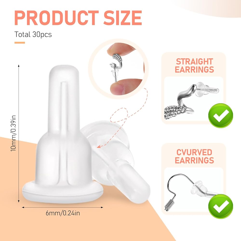• earring backs replacements: Our package includes 30PCS silicone earring backs replacements, ensuring you have plenty of spares for all your favorite earrings. These earring backs are designed to fit a variety of earring styles, including studs, hooks, and heavy earrings, providing a versatile solution for your jewelry needs