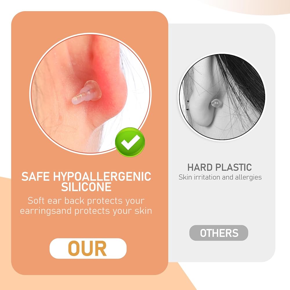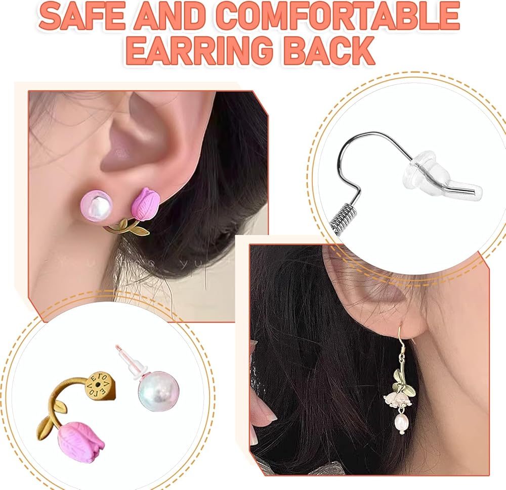 • silicone earring backs: Made from high-quality silicone. The soft and flexible material ensures a comfortable fit, making them ideal for daily wear. The silicone design also provides a secure grip, preventing your earrings from slipping or falling out