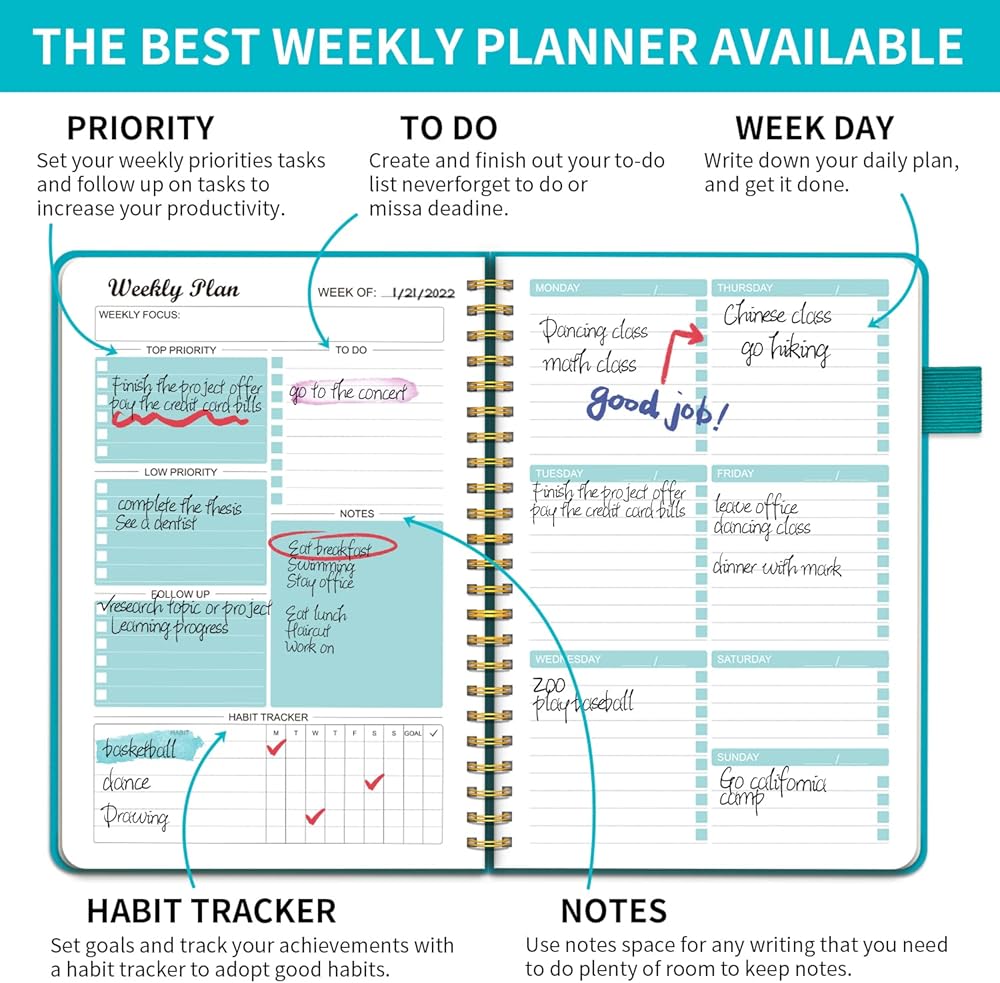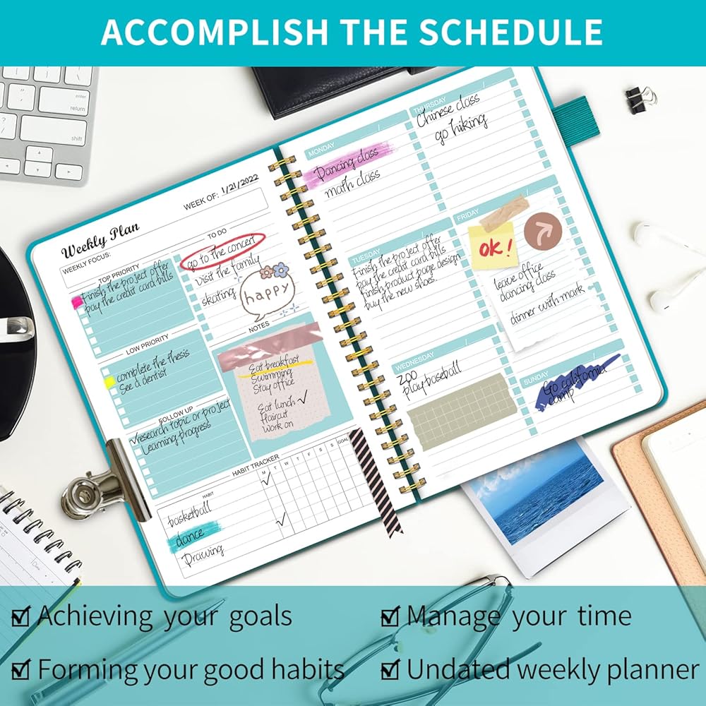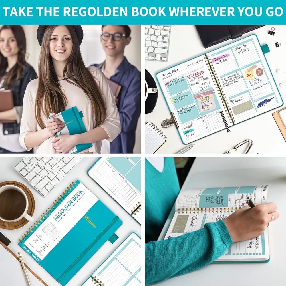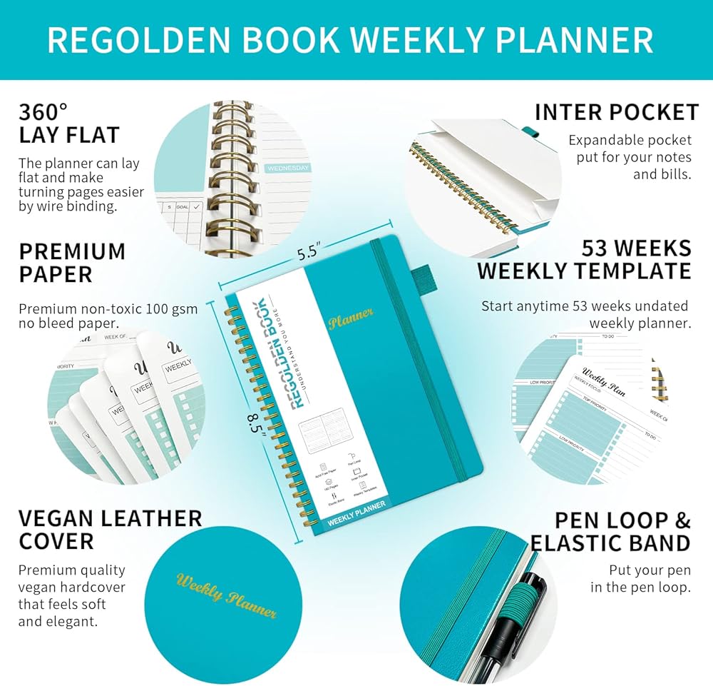 مخطط أسبوعي غير مؤرخ، مخطط جدول الأهداف الأسبوعية، دفتر ملاحظات بغلاف صلب من Regolden-Book للقيام بقائمة تقويمات دفتر الملاحظات، مجلة تعقب العادة للرجال والنساء، ربط حلزوني، جيب، حلقة قلم، 53 أسبوعًا (5.5 × 8.5 بوصة)