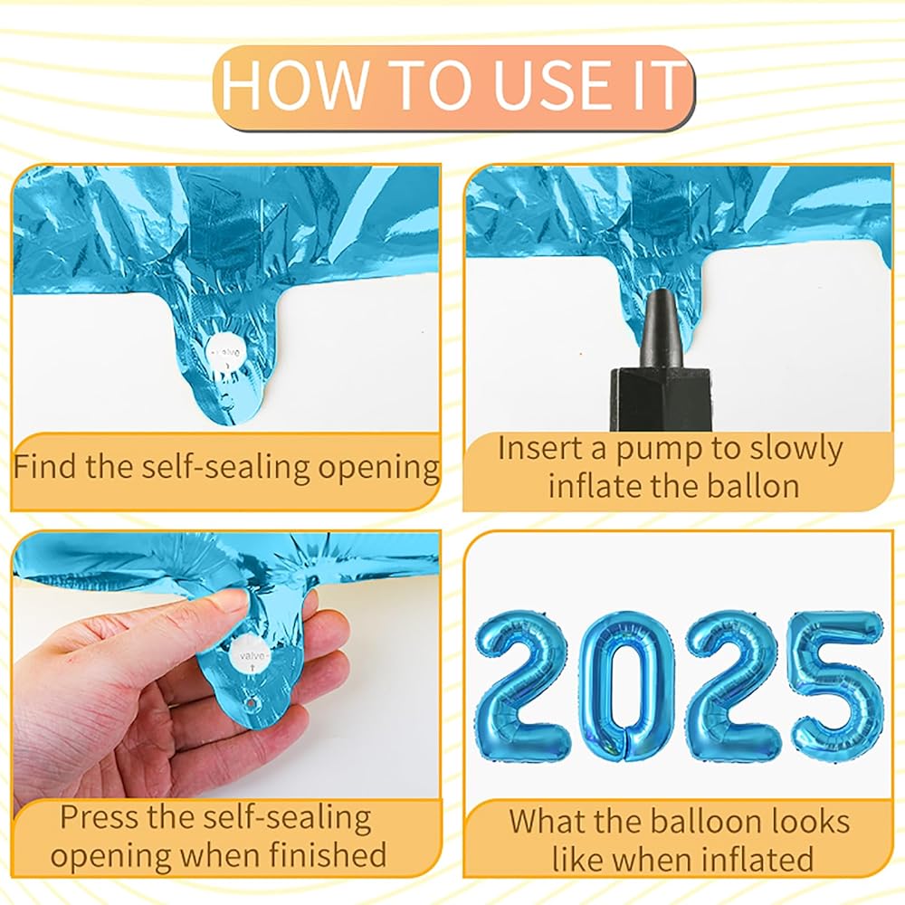 • التصميم ذاتيًا وقابل لإعادة الاستخدام - ميزة الختم الذاتي للبالونات لعدد 2025 تجعلها مريحة بشكل لا يصدق. بعد التضخم بالهواء أو الهيليوم باستخدام القشة المقدمة ، لا داعي للقلق بشأن تسرب الغاز. علاوة على ذلك ، فهي قابلة لإعادة الاستخدام. بمجرد انتهاء الحفلة ، يمكنك بسهولة أن ترفعها وتخزينها للاستخدام في المستقبل.