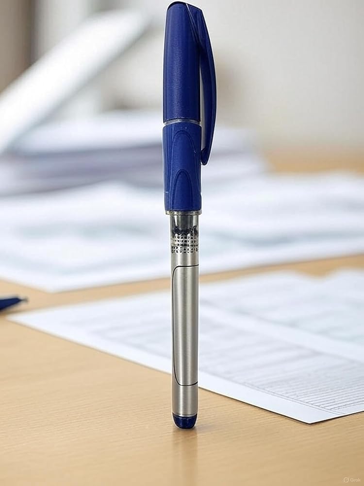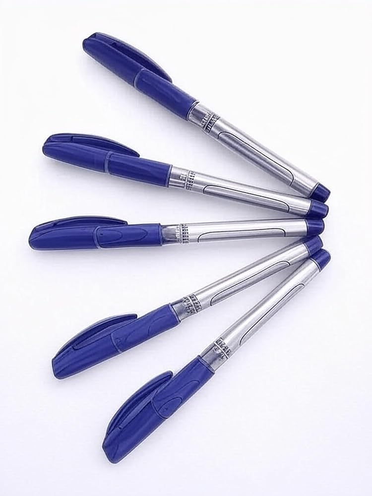 Experience smooth, precise writing with these premium ballpoint pens featuring a sleek silver and blue design. The 0.5mm fine point tip delivers clean, consistent lines perfect for detailed note-taking, documentation, and everyday writing tasks. The ergonomic grip zone and balanced weight distribution provide comfortable extended use, while the durable metal clip keeps your pen securely in place. Each pen in this 5-pack features reliable blue ink that flows smoothly without skipping or bleeding. The sophisticated metallic barrel adds a professional touch to your writing instrument collection. These pens are ideal for students, professionals, and anyone who appreciates quality writing tools that combine style with functionality. The fine point creates crisp, defined lines that work well on various paper types, making these pens versatile for multiple writing applications.