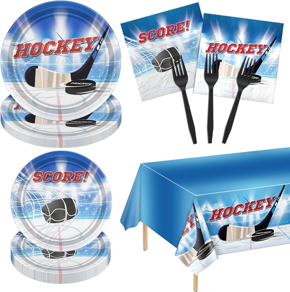 High Quality: Plates and napkins are made of thick paper, lightweight, and safe. Forks and hockey tablecloth are made of plastic, which is waterproof, durable, and stain resistant, tablecloth could protect your table well.