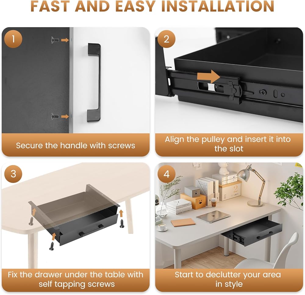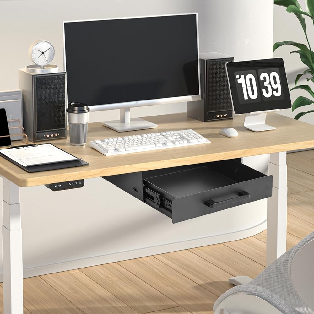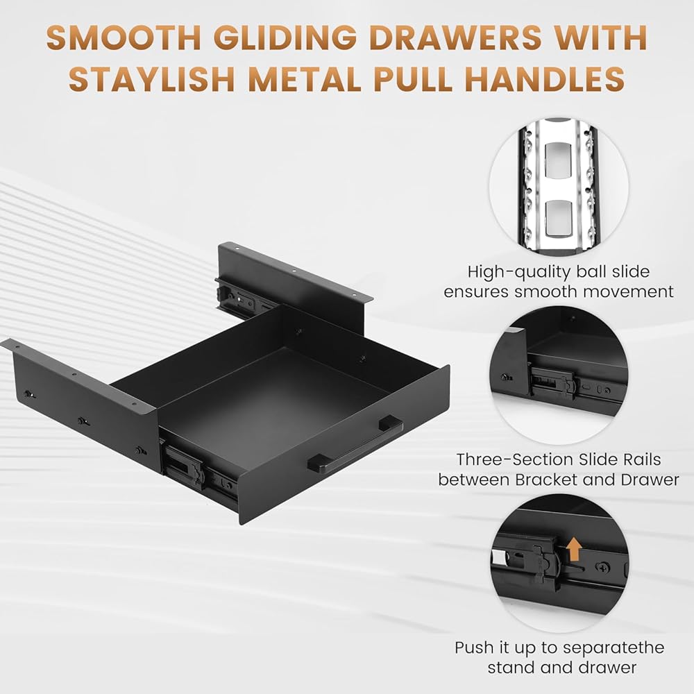 تنزلق بسلاسة تحت درج الجرف: ينزلق درج الجرف تحت الجهد على مسارات هادئة وسلسة ، مما يضمن سهولة الوصول إلى العناصر الخاصة بك. يسمح لك المقبض الأمامي الأنيق بسحب الدرج إلى الخارج بسهولة ، مما يجعله مثاليًا للاستخدام اليومي. حافظ على أن مساحة العمل الخاصة بك تبدو أنيقة ومهنية أثناء تخزين الورق ، وكتابة الأواني ، والأجهزة الإلكترونية ، واللوازم المكتبية ، والمزيد!