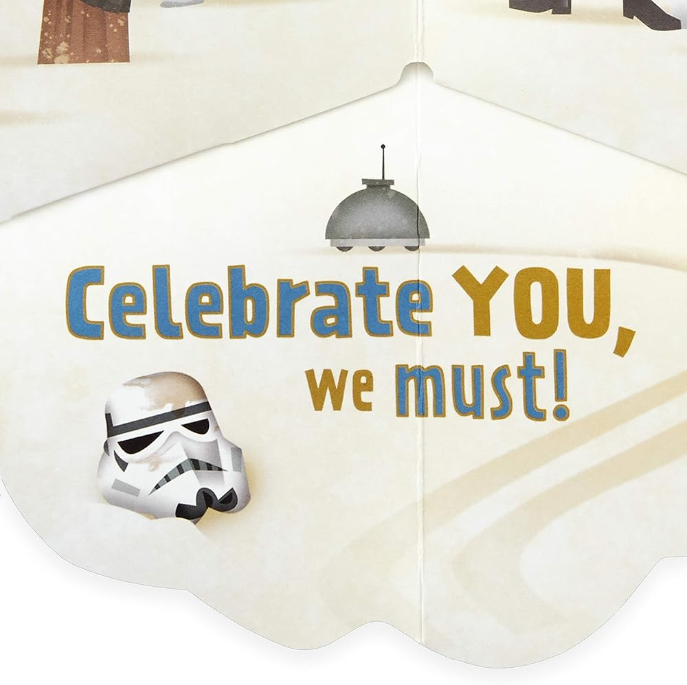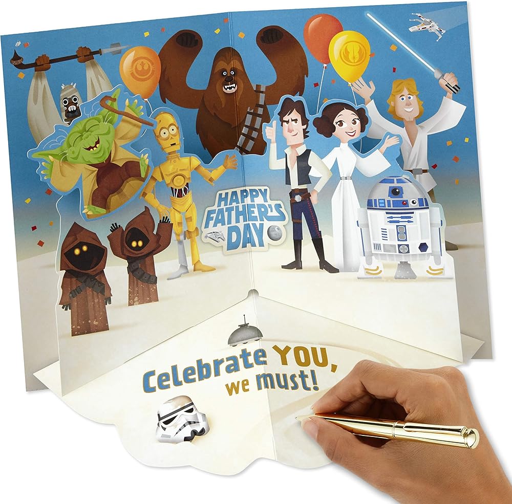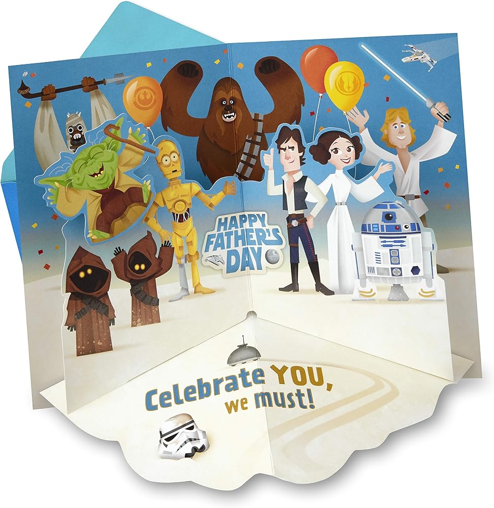 • Inside of card pops out to reveal cartoons of Han, Leia, R2-D2, C-3PO, Yoda, Luke, Chewbacca and more with text that reads: "Celebrate you, we must! Happy Father's Day"