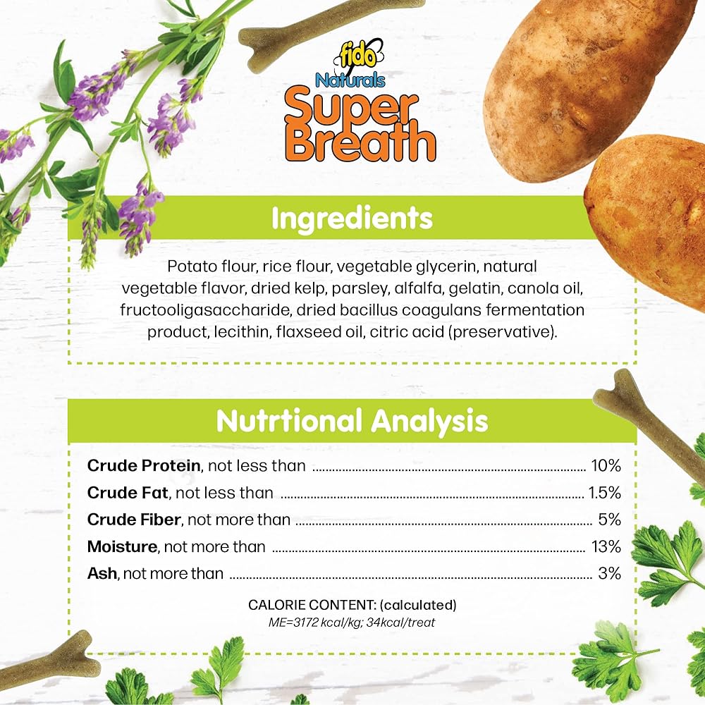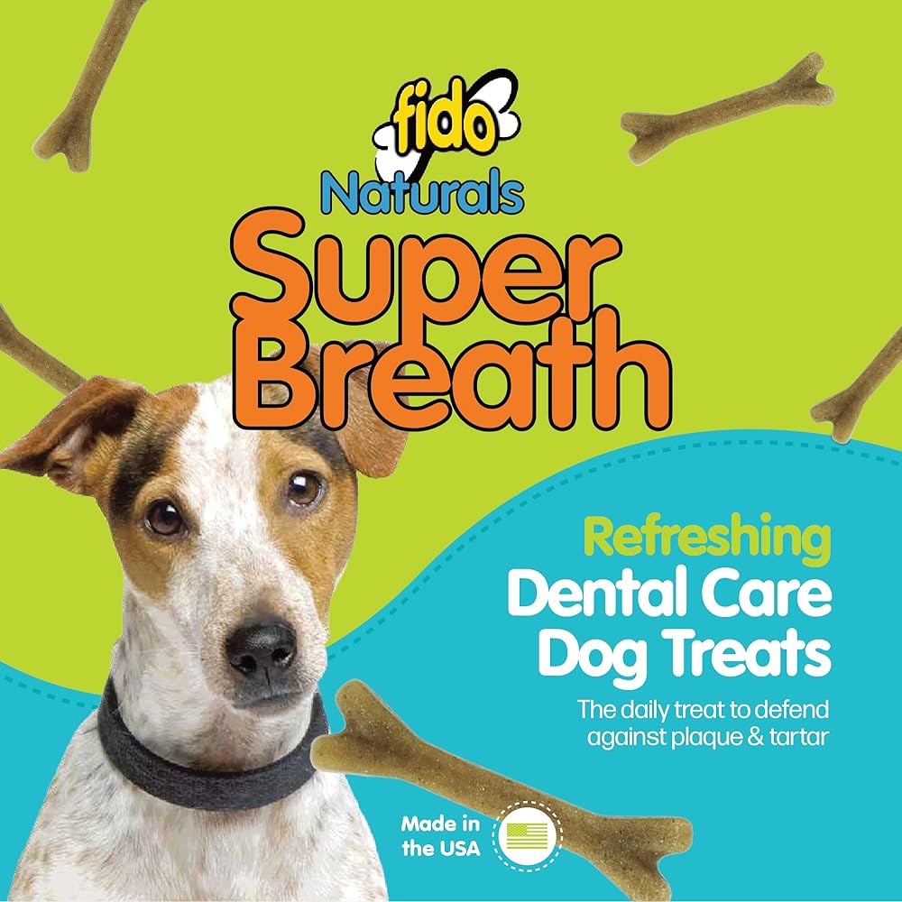• Fido Naturals Super Breath Dog (متوسط) - عظام رعاية الأسنان اللذيذة للكلاب المتوسطة (25 - 50 رطلاً). يساعد في تقليل تشكيل البلاك والترتار. تنفس التنفس مع المضغ اليومي. يشمل (3) أكياس 8 أوقية.